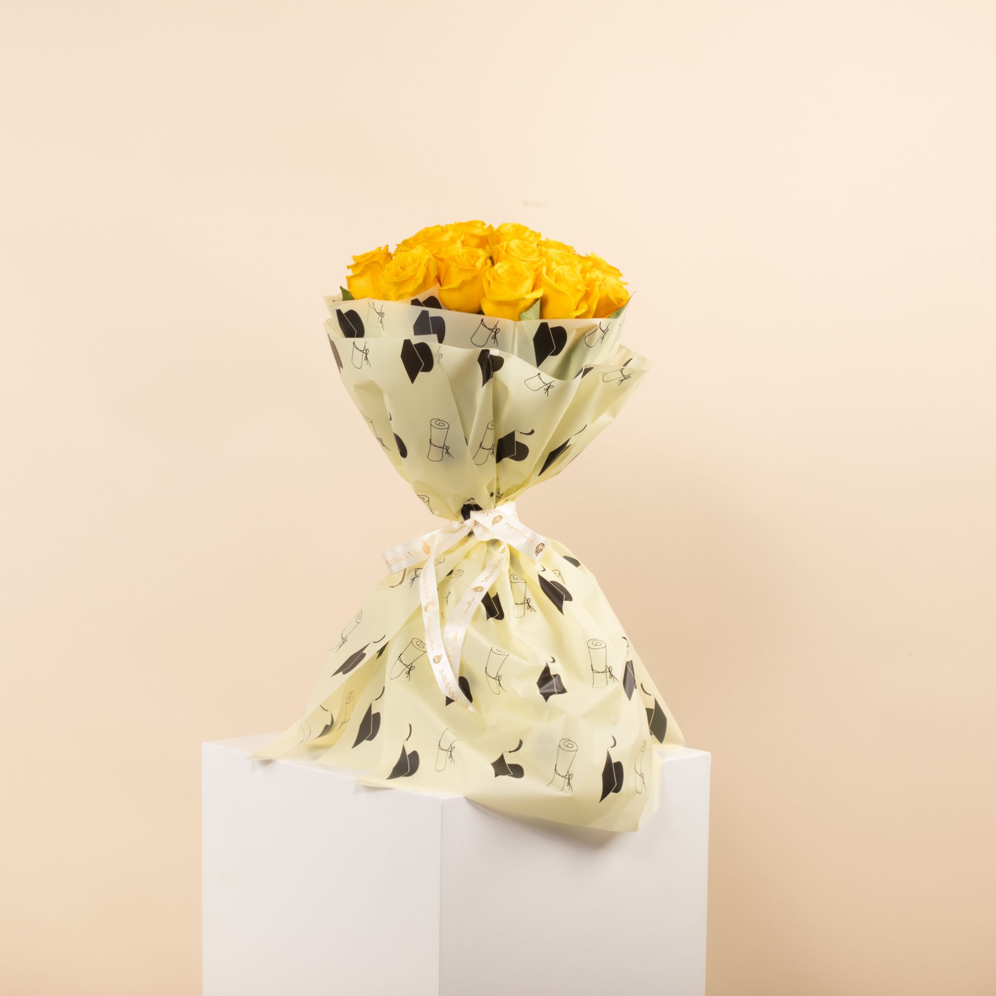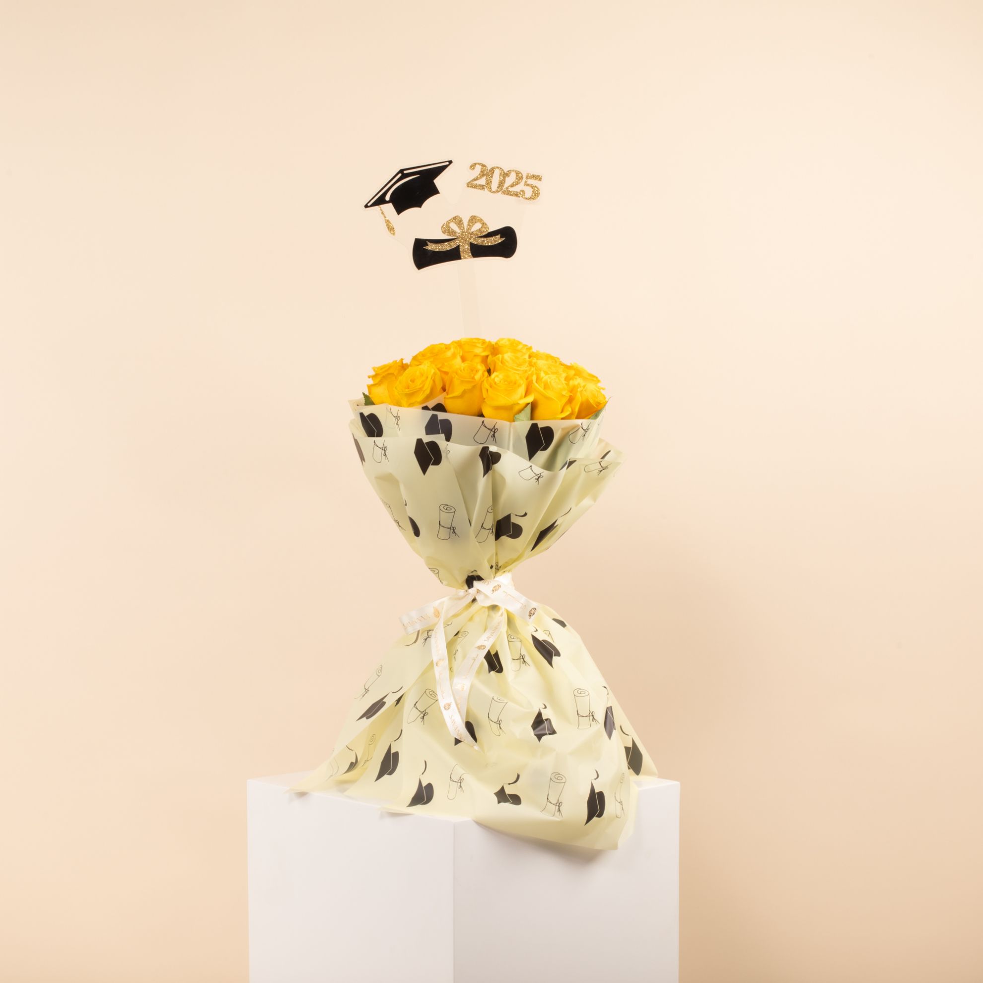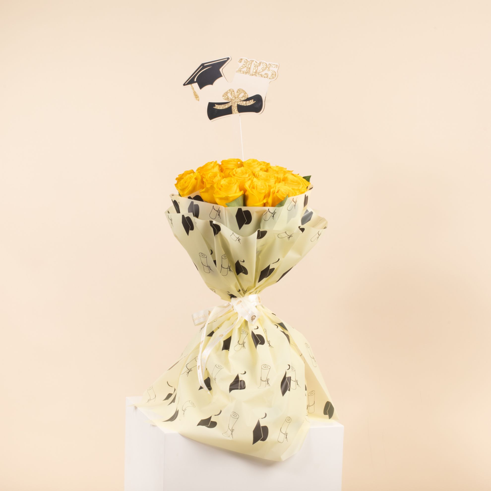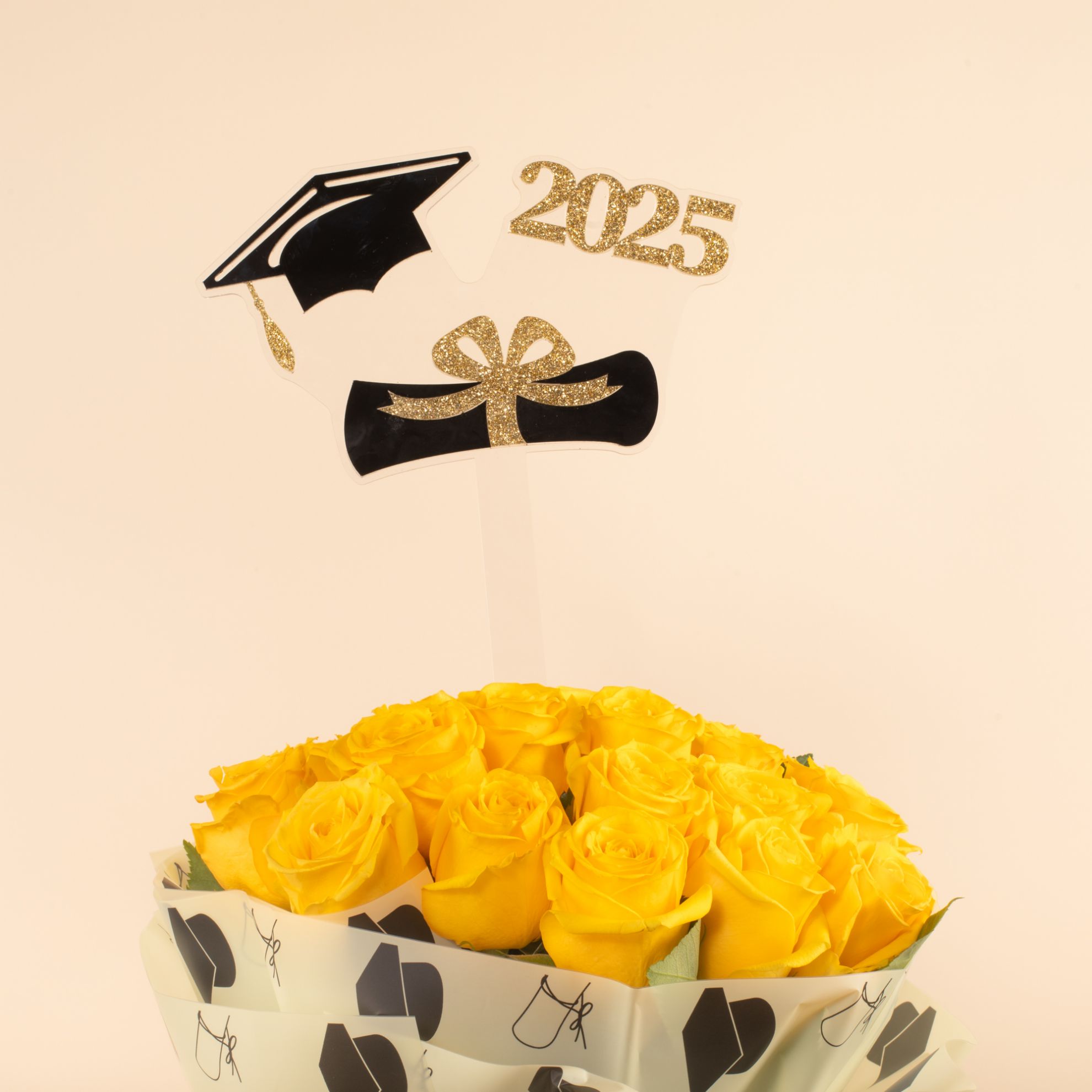 Celebrate graduation with our Hand Bouquet featuring 25 Yellow Roses! Bright and cheerful, this bouquet symbolizes joy, success, and new beginnings. A perfect gift to add a burst of color and positivity to their special day. Order now and make their graduation even more memorable!