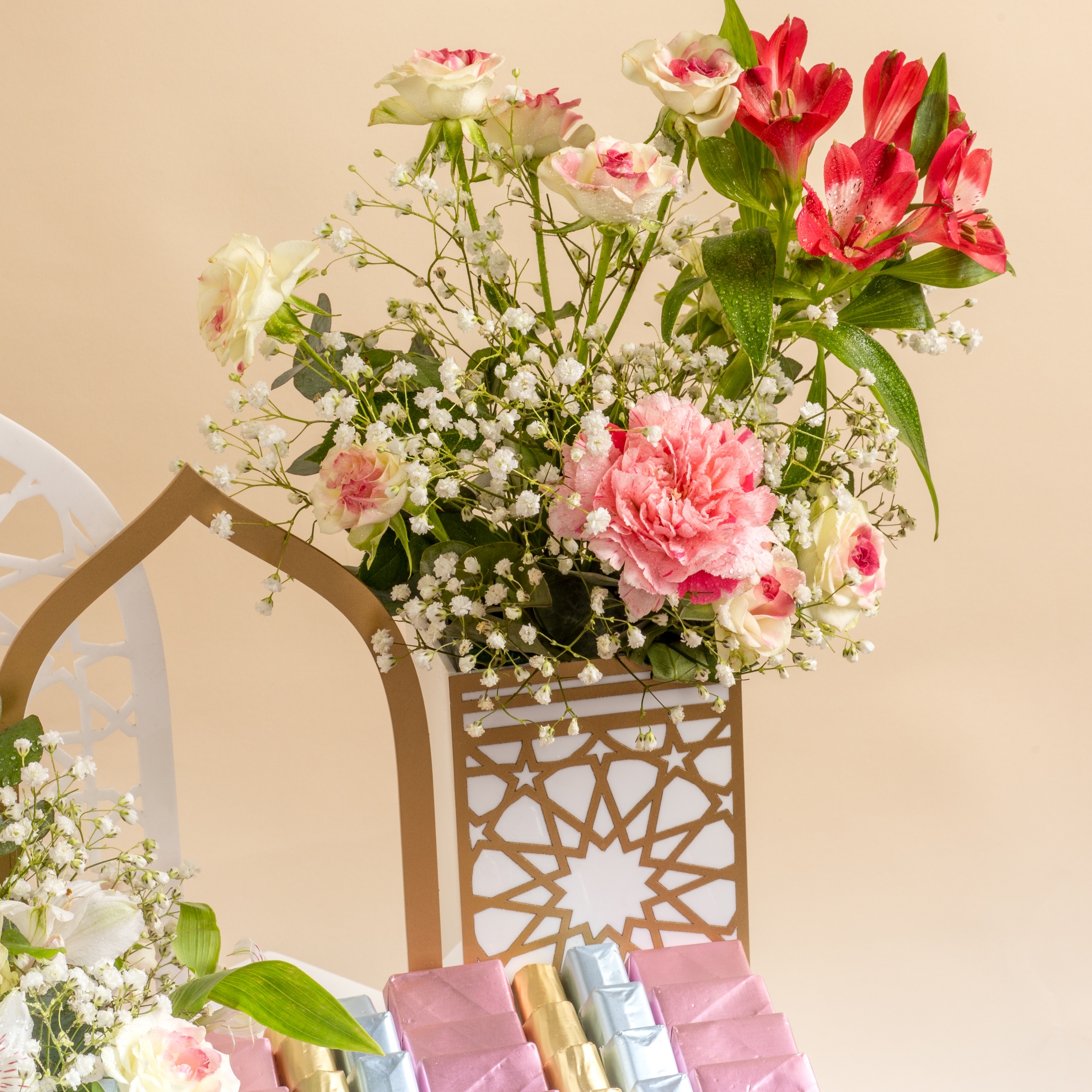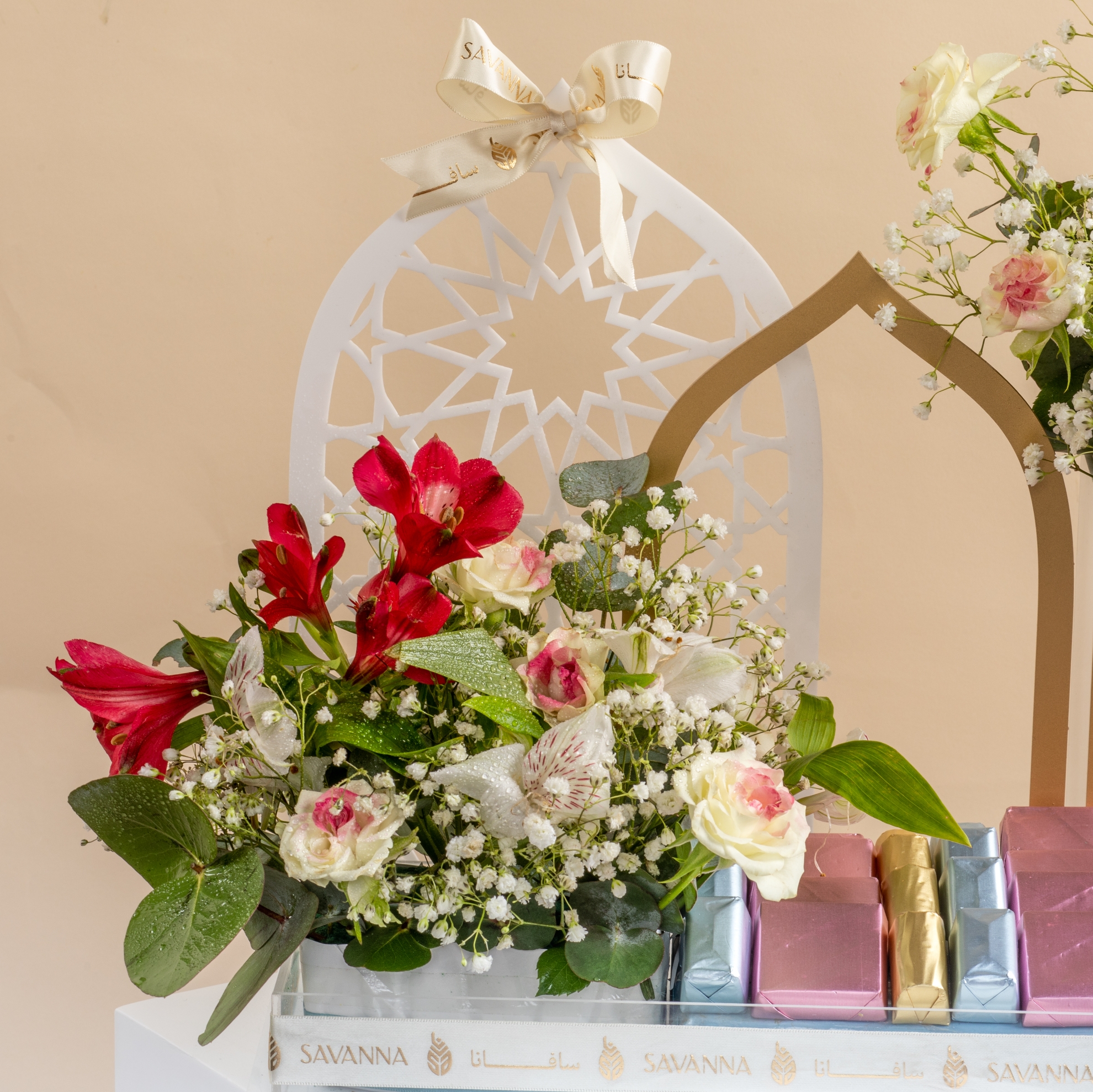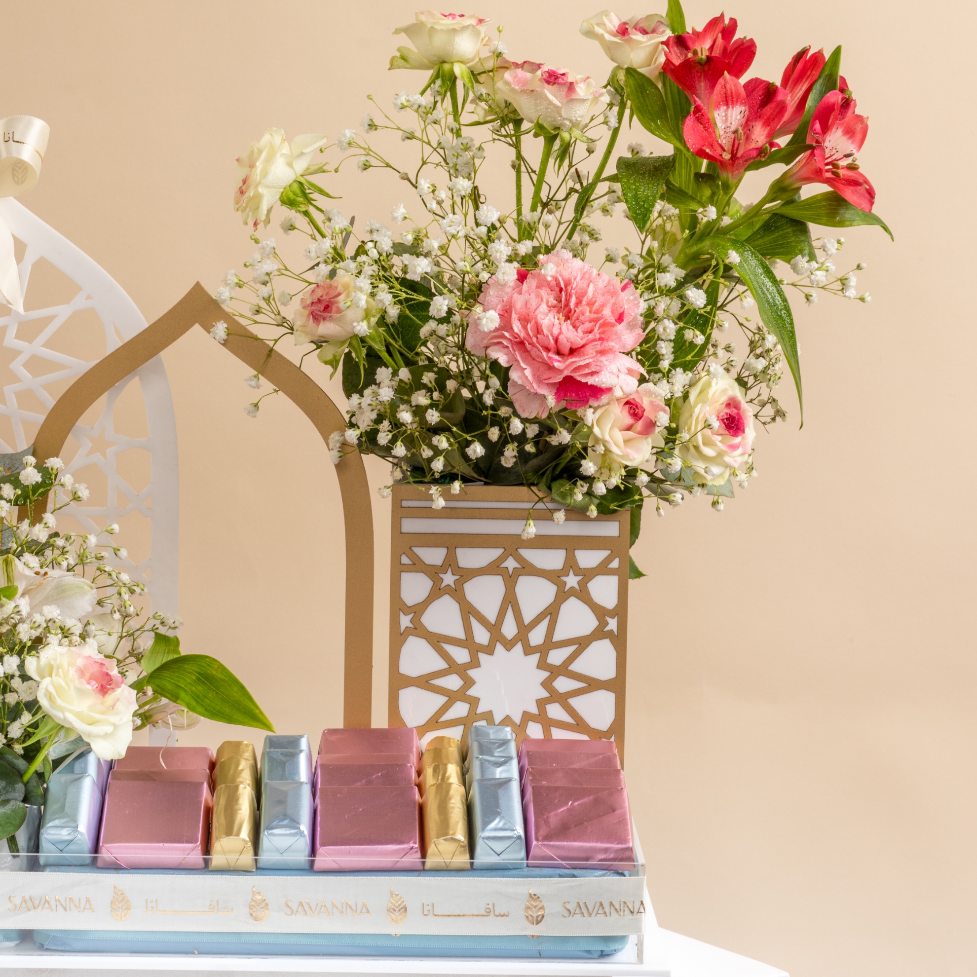 avanna Hajj Chocolate Tray – 32 PiecesMilk chocolate with mixed nuts and pistachio filling, beautifully presented alongside an elegant floral arrangement of white baby roses, gypsophila, pink alstroemeria, and carnations.