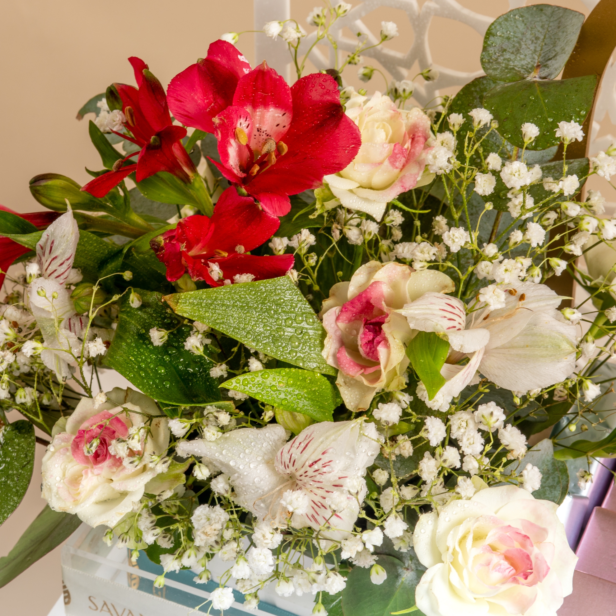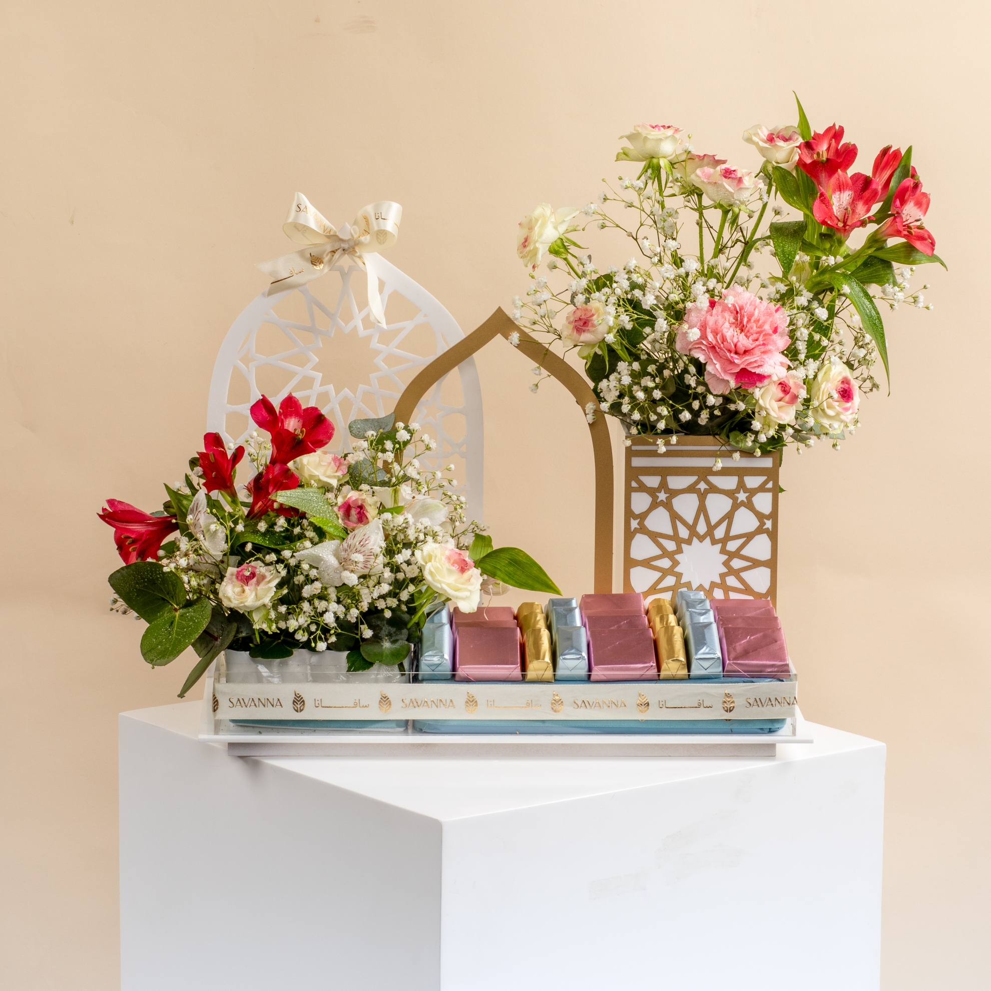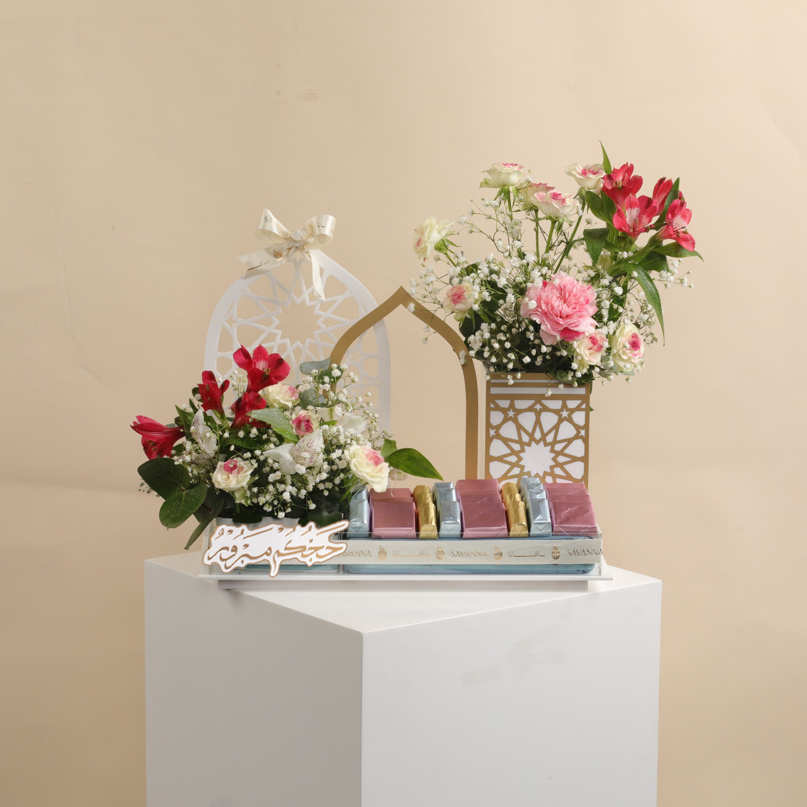 avanna Hajj Chocolate Tray – 32 PiecesMilk chocolate with mixed nuts and pistachio filling, beautifully presented alongside an elegant floral arrangement of white baby roses, gypsophila, pink alstroemeria, and carnations.