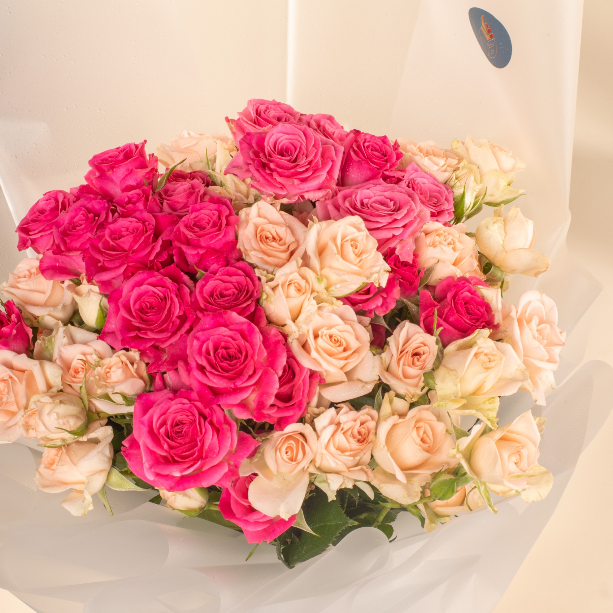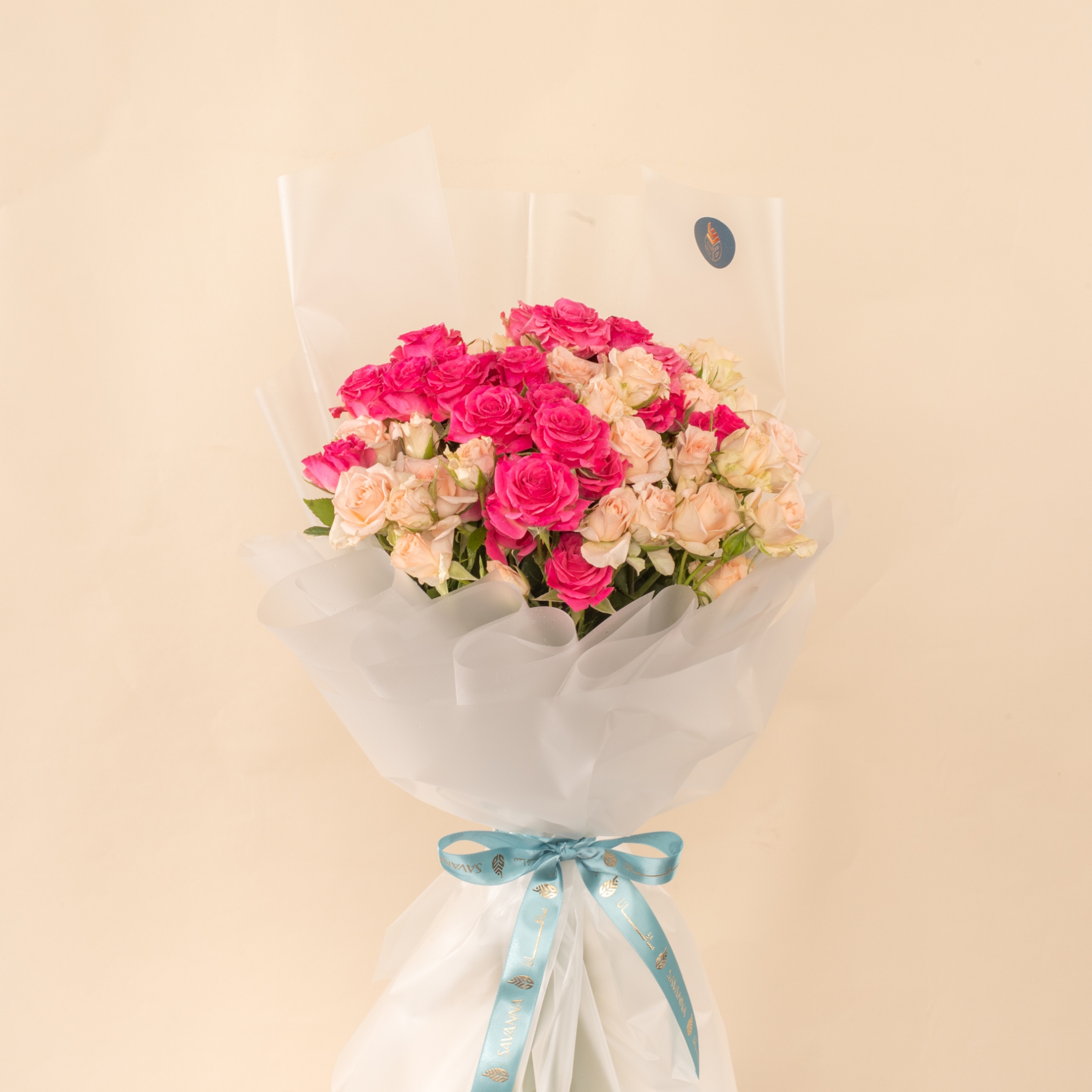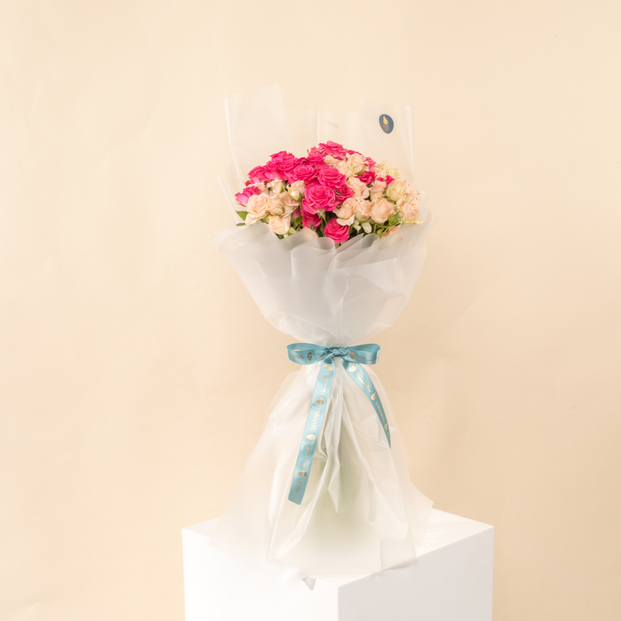 Savanna Hand Bouquet | Baby Rose Peach & FuchsiaA charming mix of peach and fuchsia baby roses, elegantly wrapped in white. A fresh and stylish bouquet perfect for any heartfelt occasion.