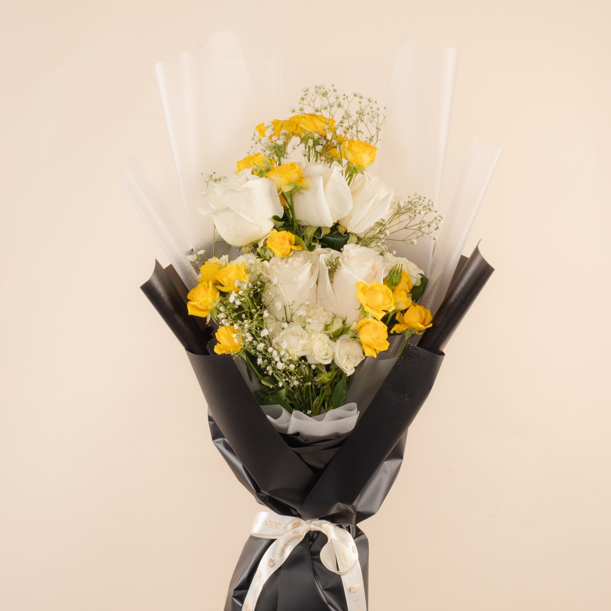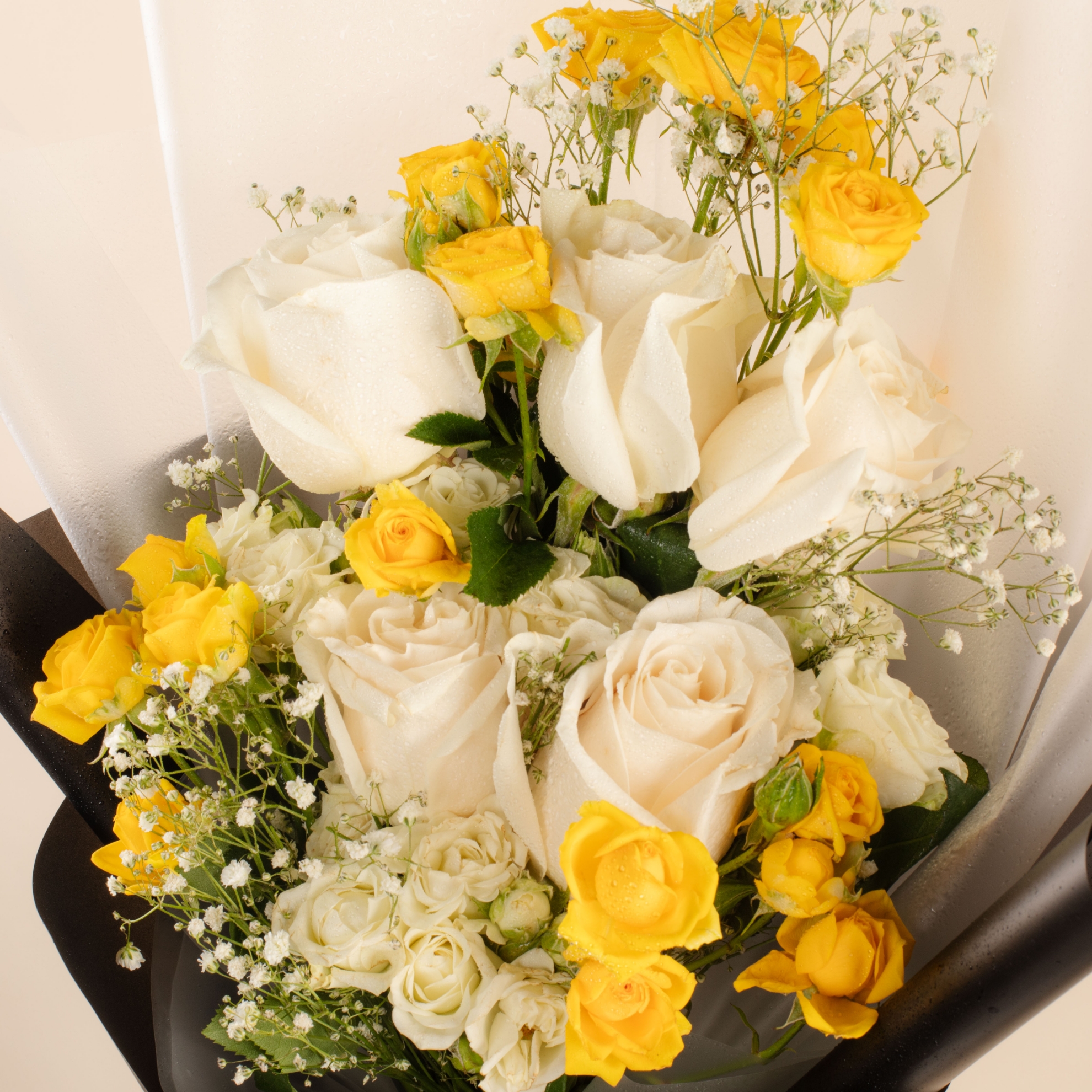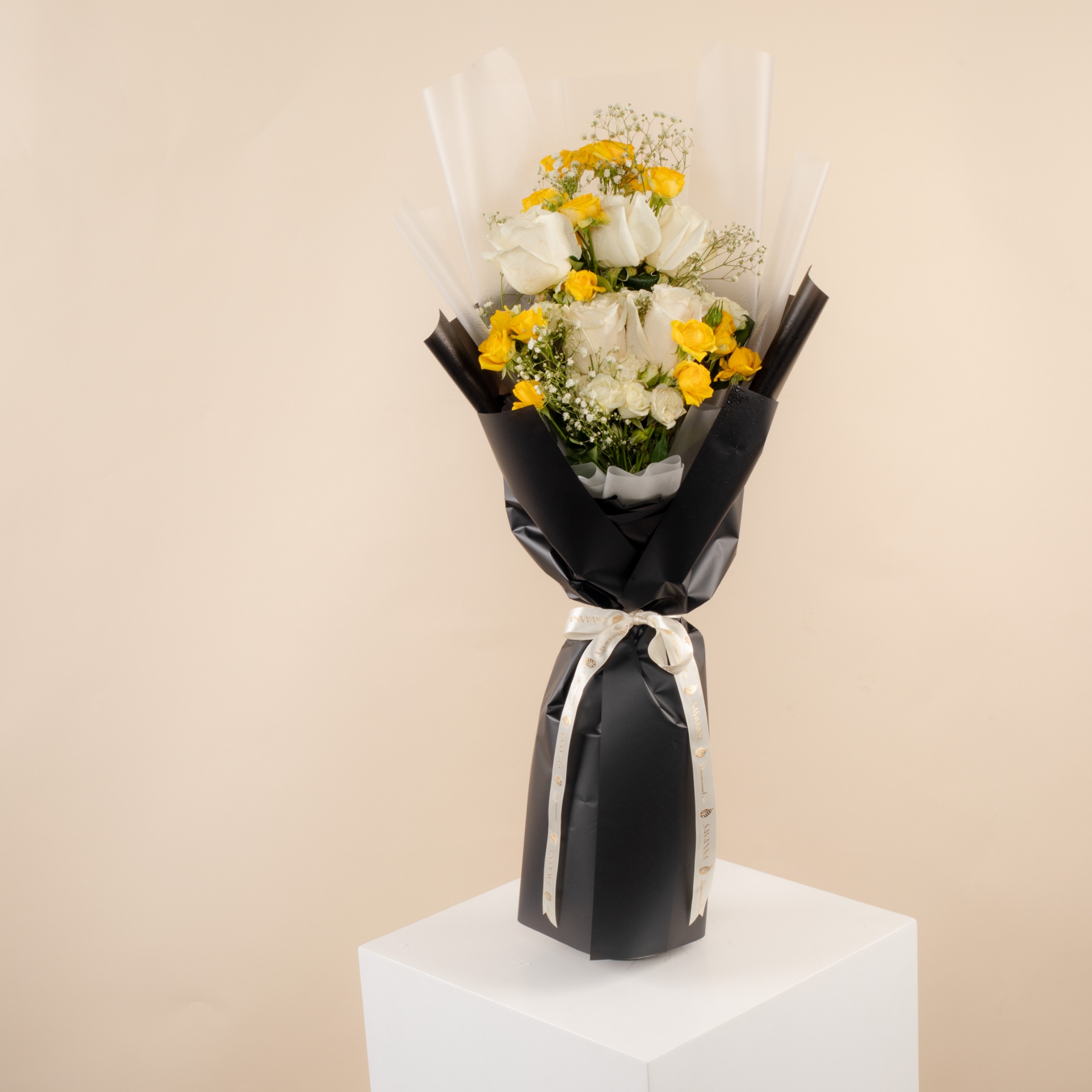 Savanna Hand BouquetA cheerful mix of yellow and white roses with delicate white gypsophila, elegantly wrapped in black and white. A perfect bouquet to brighten any day with grace and charm.