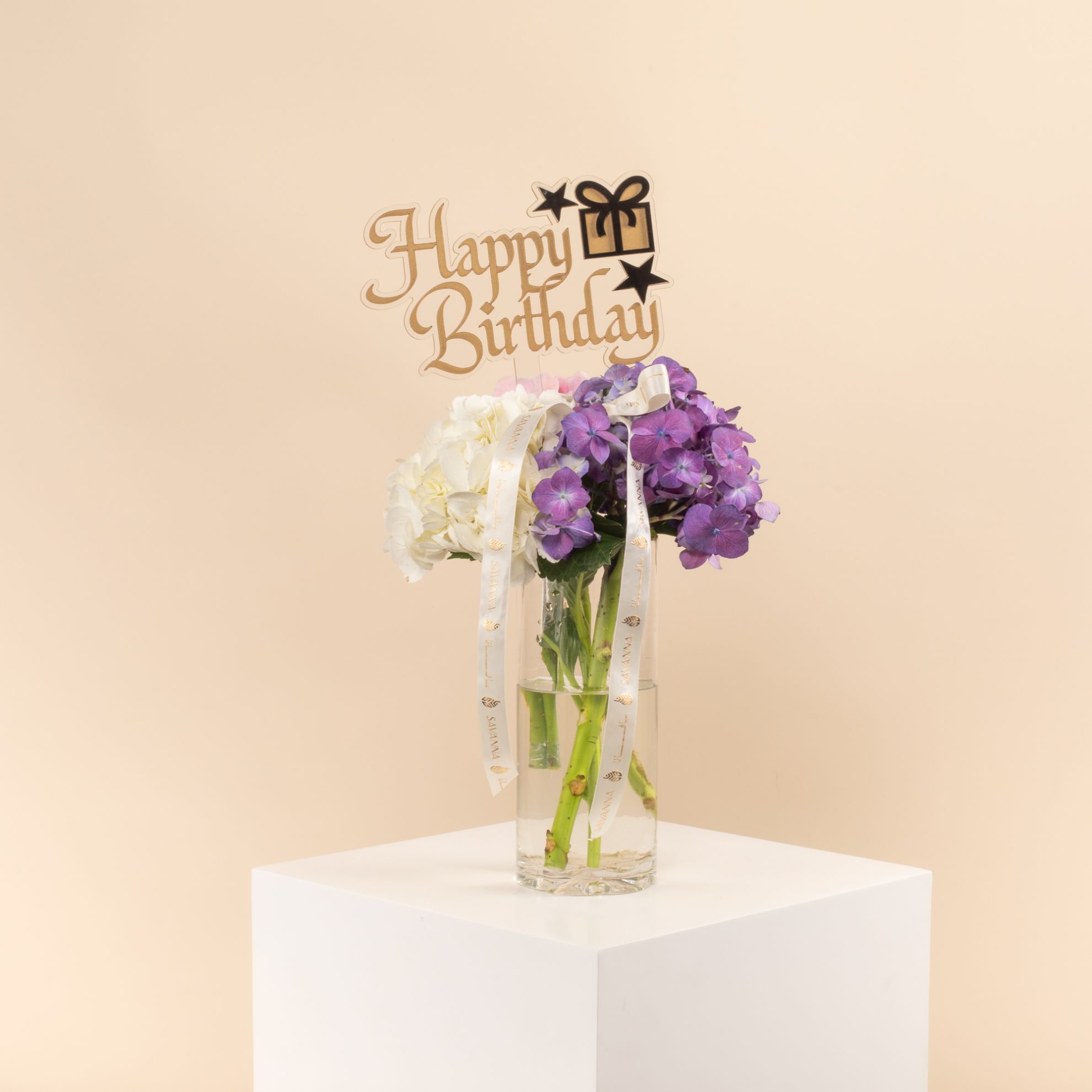 A poetic blend of grace and charm — this exquisite arrangement of soft white and rich purple hydrangeas rests gently in a crystal-clear glass vase, radiating timeless beauty and refined sophistication. Perfect as a centerpiece for your space or a meaningful gift that speaks volumes without saying a word. Wrapped in elegance, made with love — only at Savanna.
