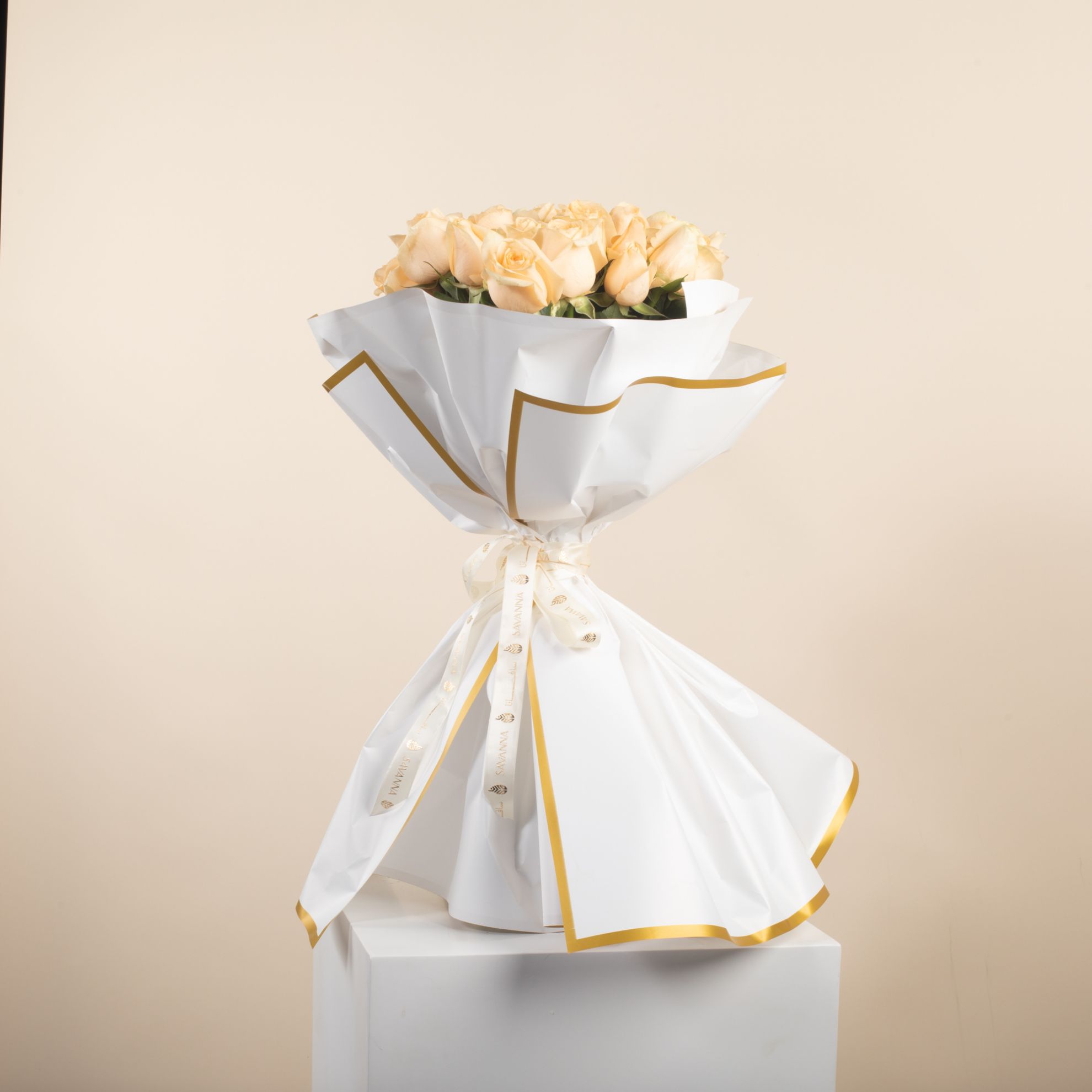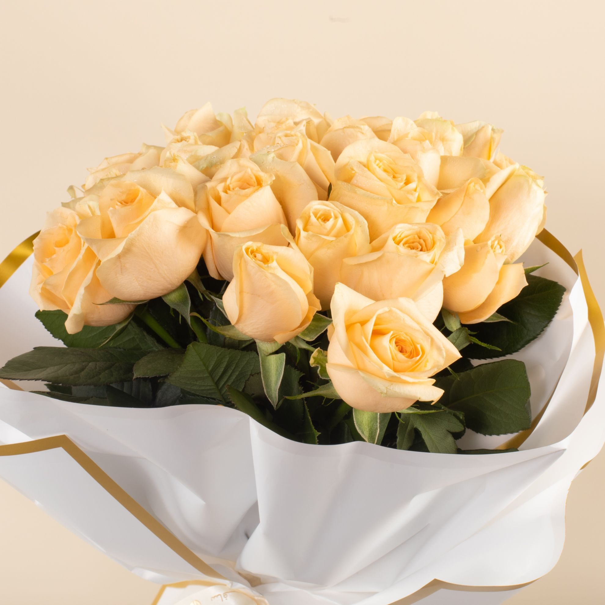Delight in the charm of our Peach Roses Hand Bouquet, featuring 25 lush blooms wrapped in a luxe white-gold finish. Perfect for expressing love, gratitude, or simply brightening someone’s day. Now available on Savanna – where every flower tells a story.