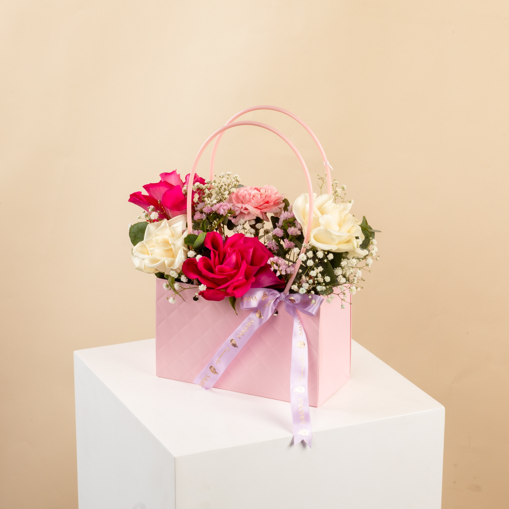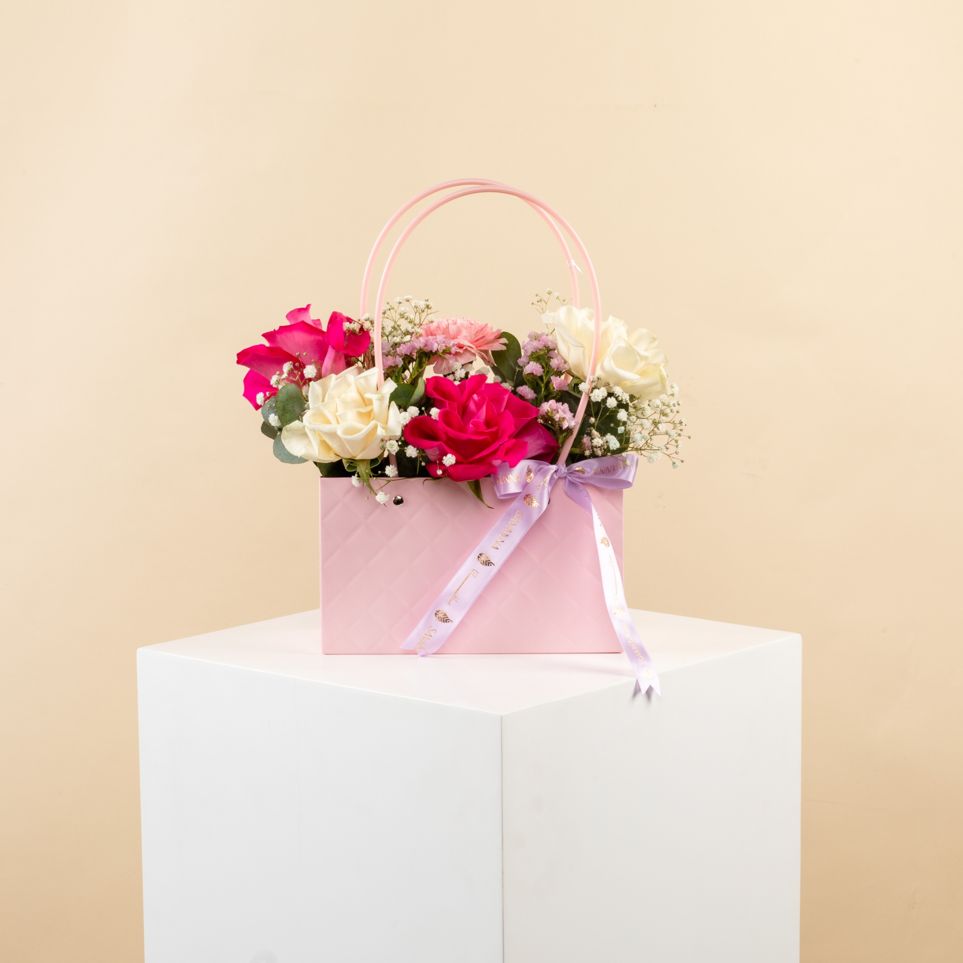 Savanna Pink Flowers BagA charming mix of fuchsia roses, white roses, pink gerbera, and delicate gypsophila — an elegant gift that brings beauty and joy to any occasion.