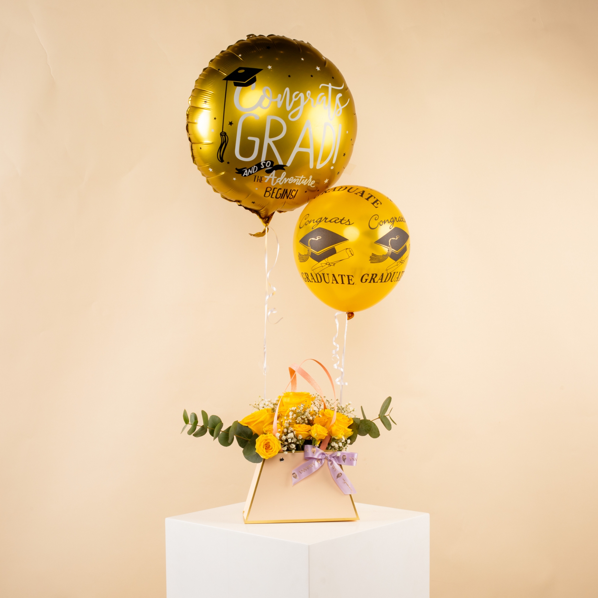 Brighten any moment with the Savanna Pink Flowers Bag with Graduation Balloon!