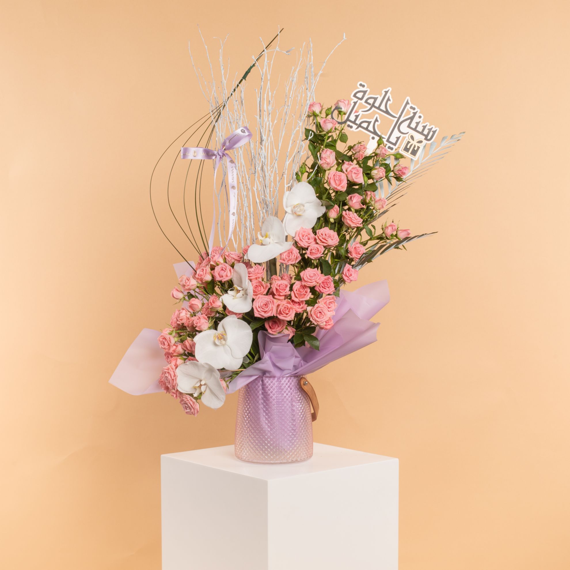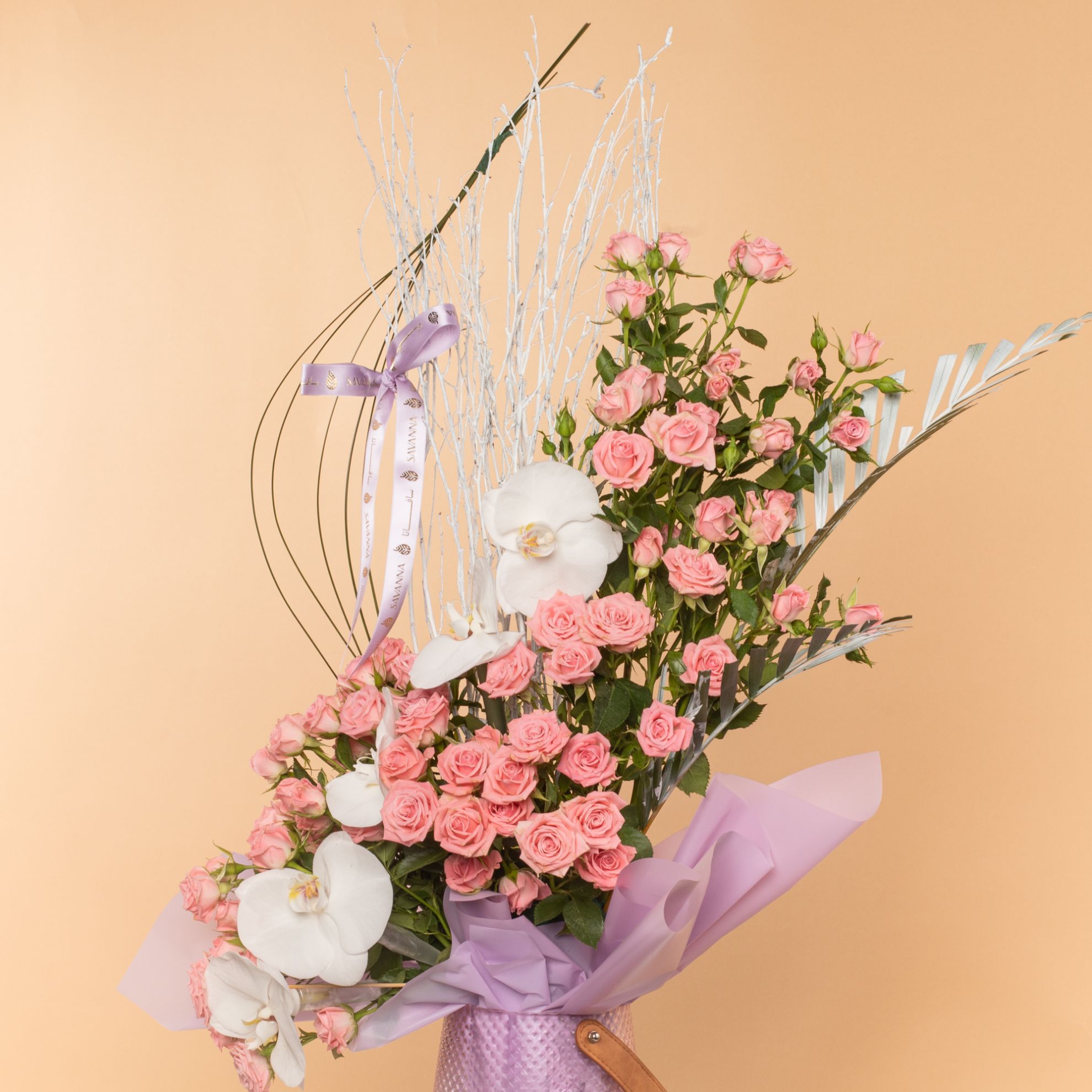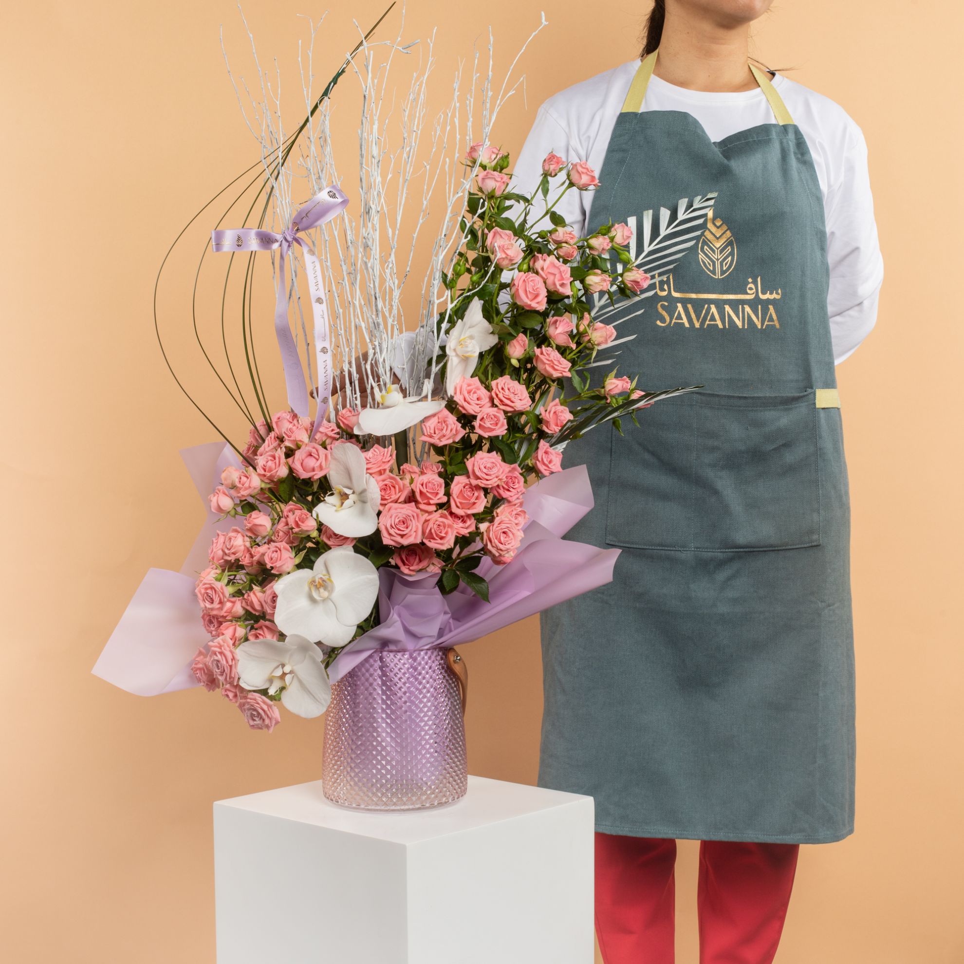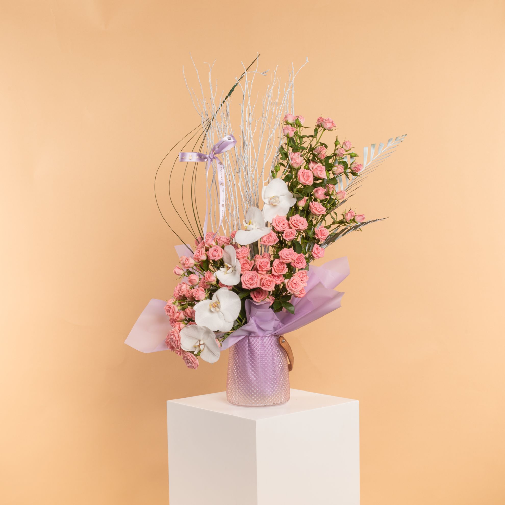 Elevate your celebrations with the Savanna Rose Enchantment Vase. This exquisite arrangement features delicate baby rose pink, phalaenopsis, steel grass, and dry salix—perfect for adding a touch of elegance and serenity to your home. Celebrate in style with this unique and beautiful centerpiece.