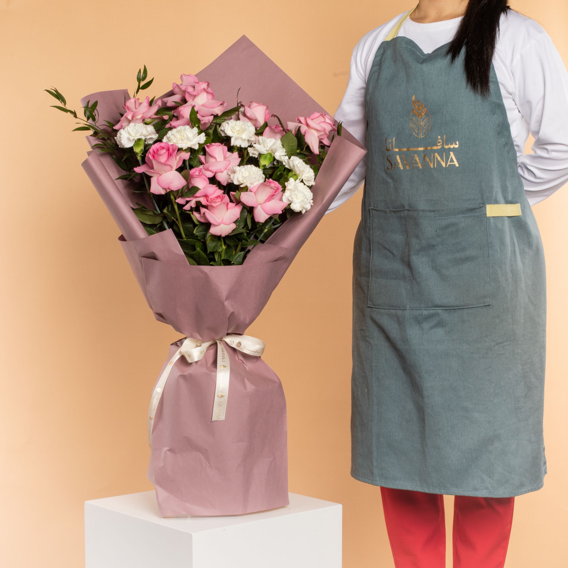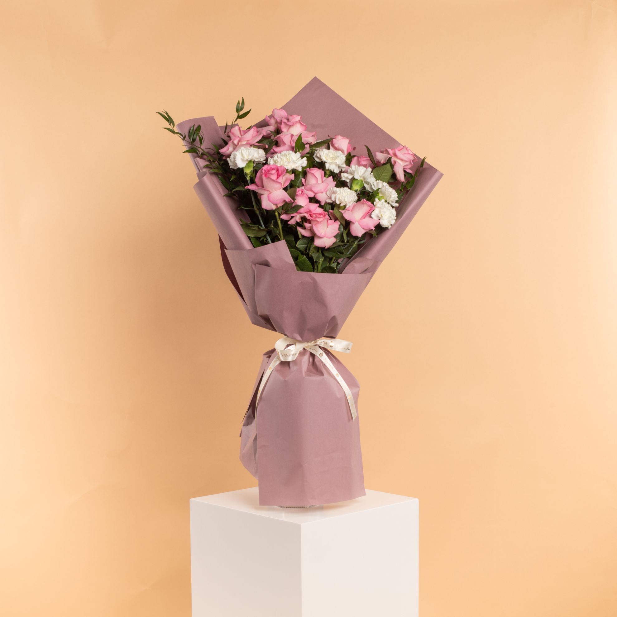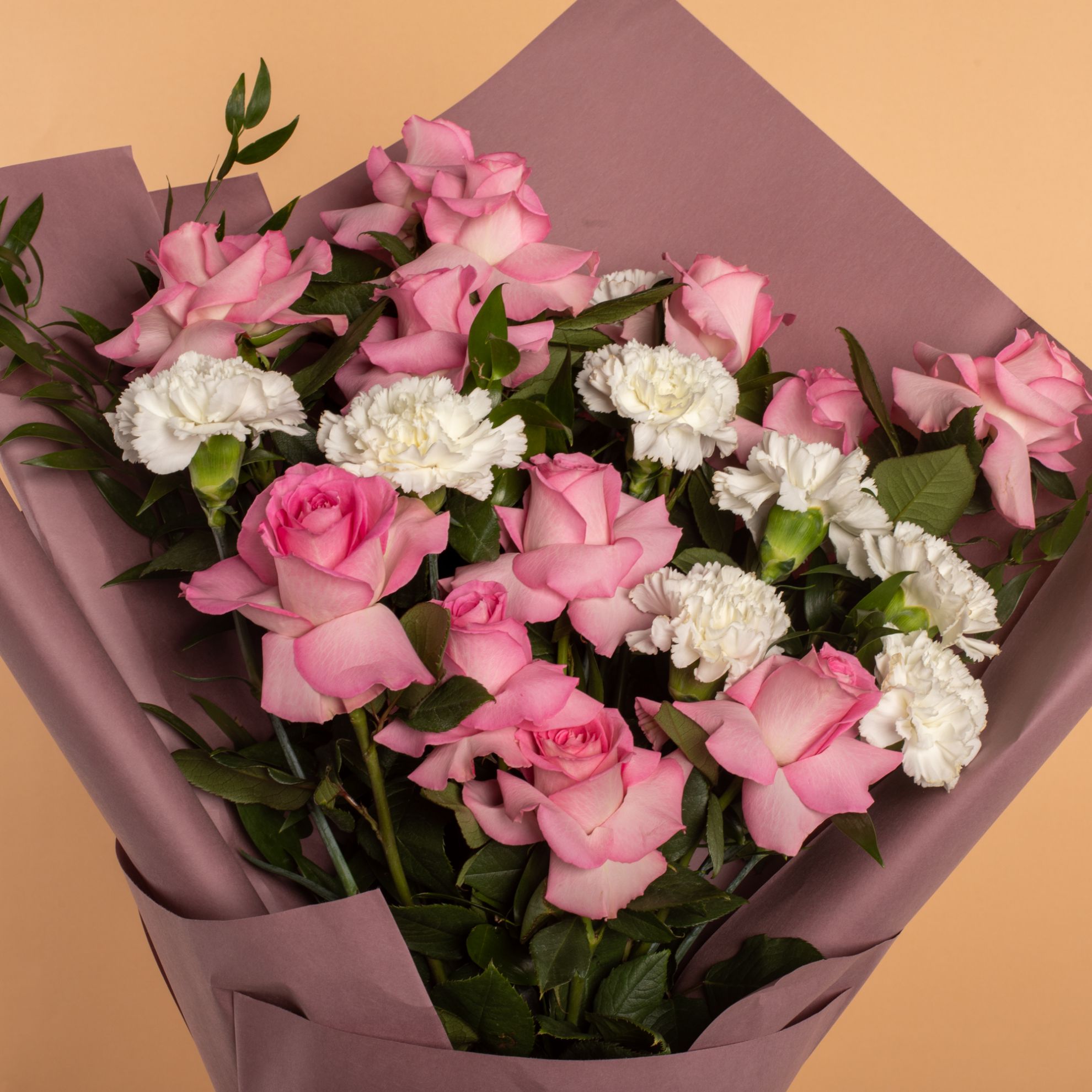 Celebrate with our Savanna Royal Blossom Bouquet! Featuring a beautiful mix of pink roses and white carnations, this elegant bouquet is the perfect way to brighten any space. A thoughtful and charming gift for your loved ones this season.