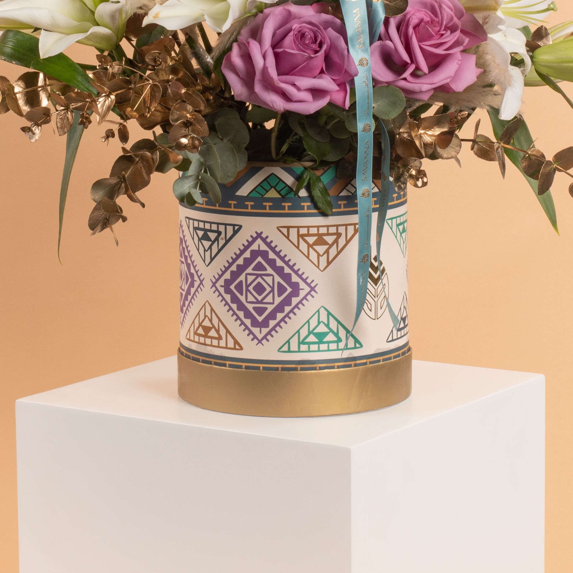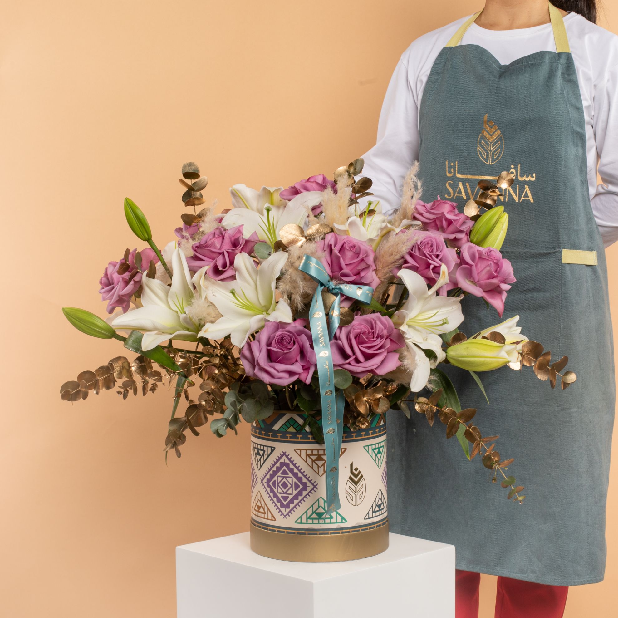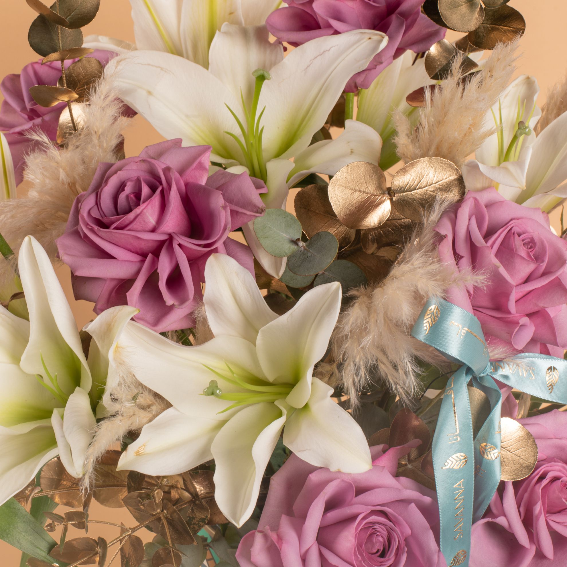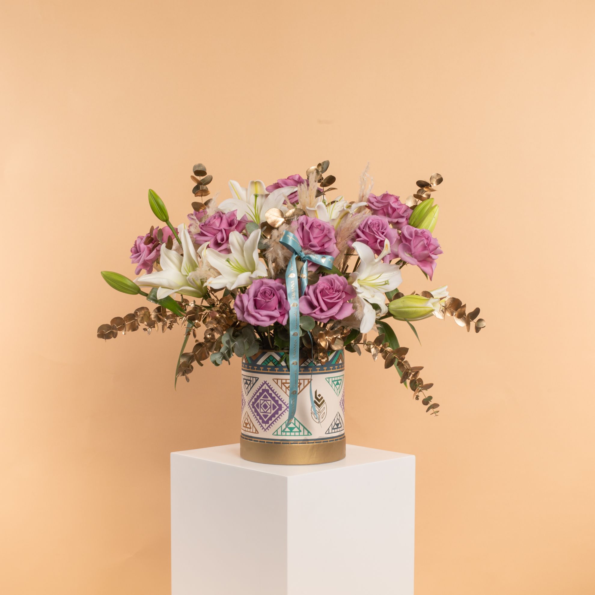 This elegant box Contains , purple roses, white lilies, and eucalyptus. A perfect gift to add charm and beauty to your festive season.