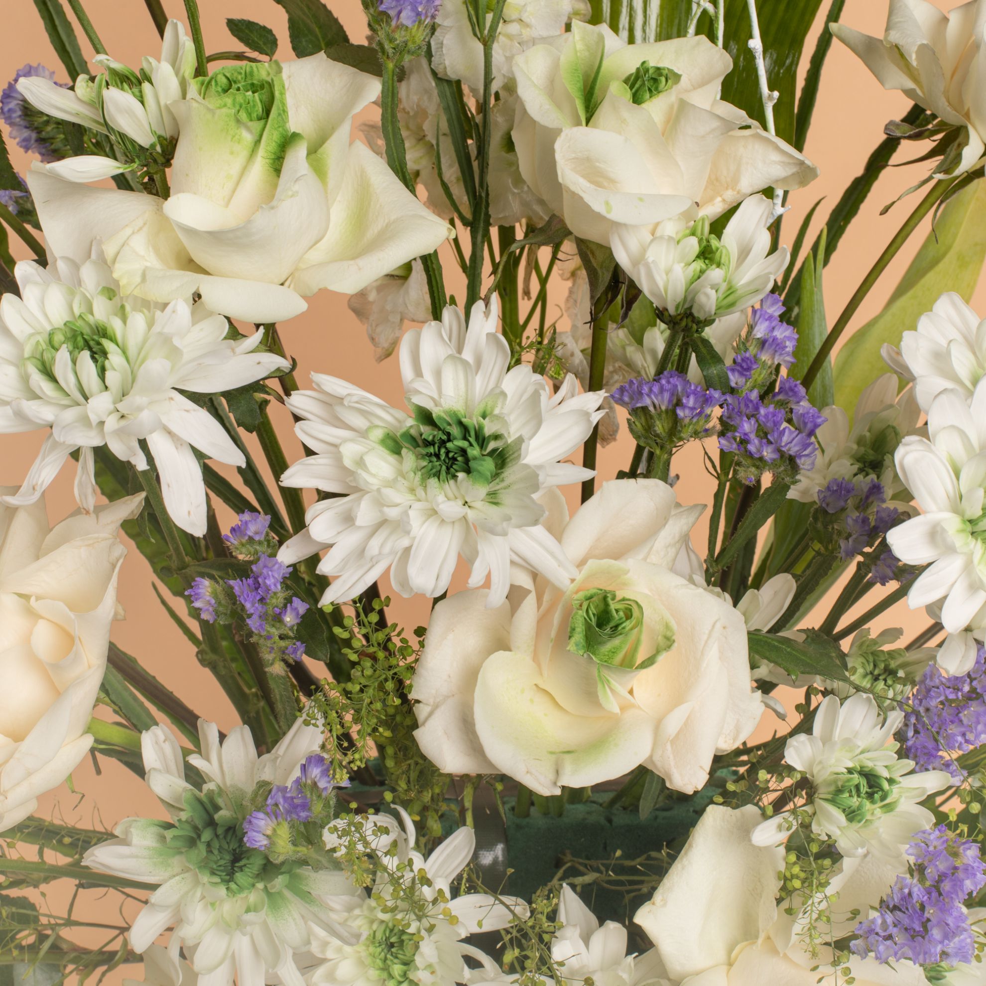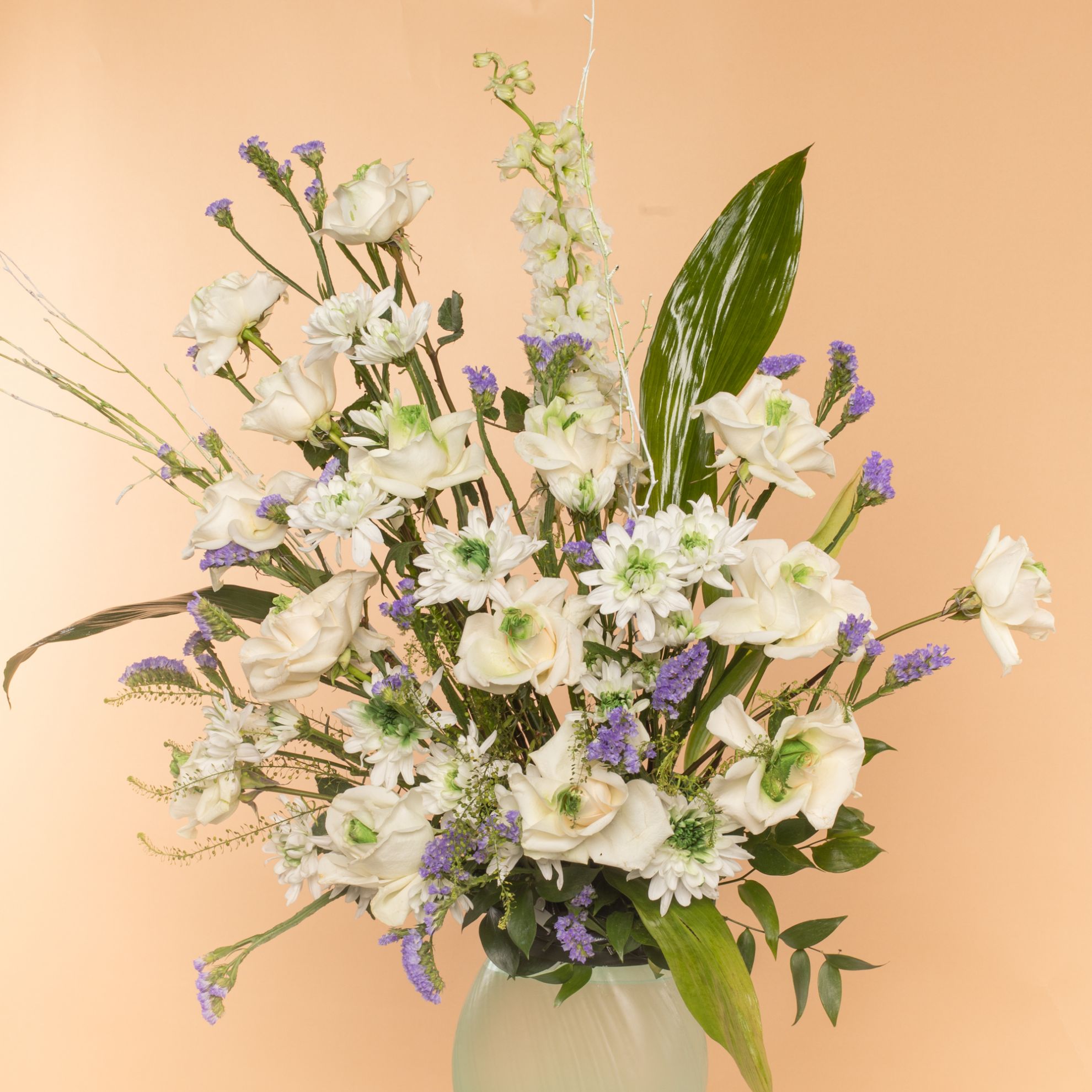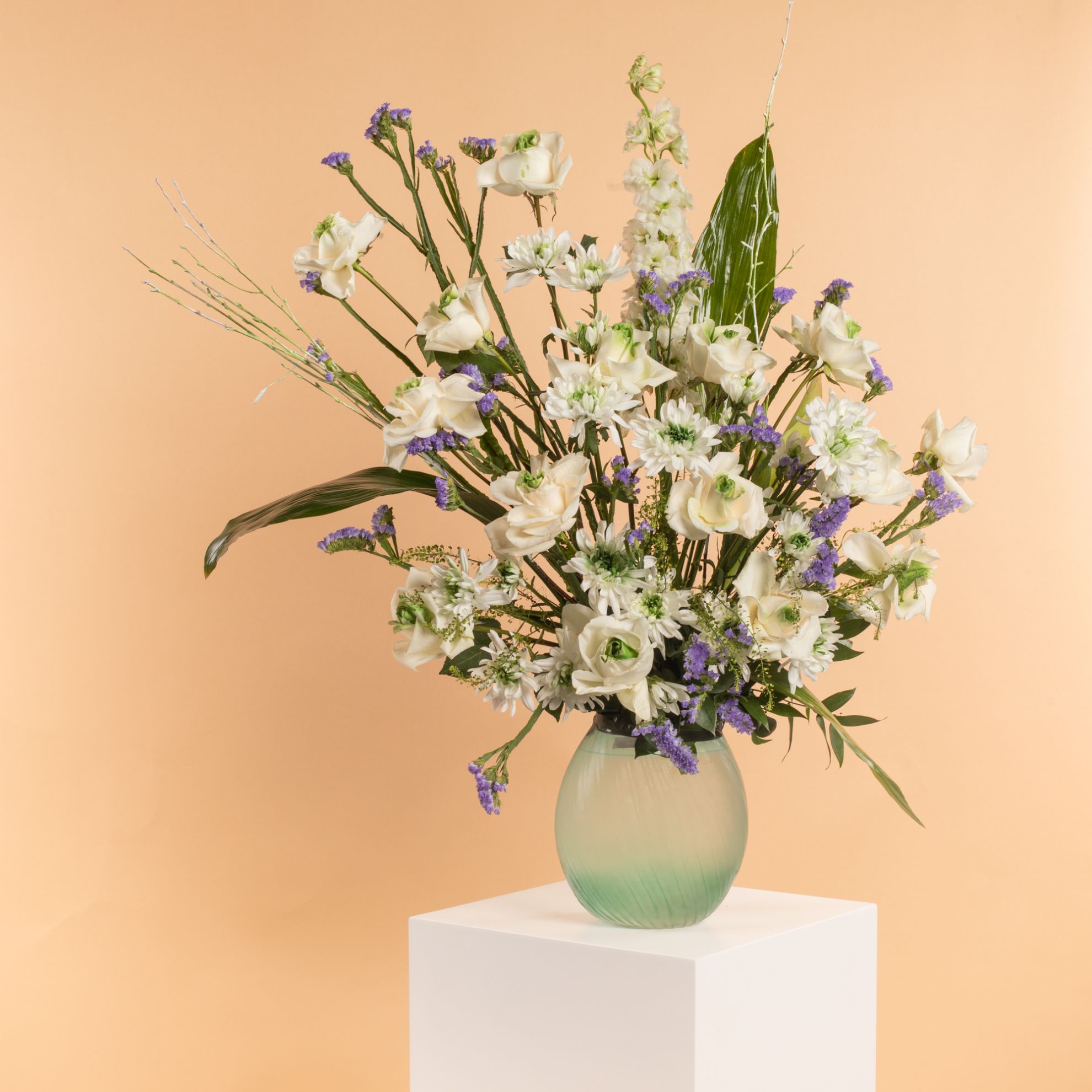 Celebrate Ramadan with our elegant flower vase! It features a beautiful blend of Ramadan stick, white roses, blue statice, delphinium, white chrysanthemums, Italian ruscus, and lipidium, all arranged in a chic vase. A perfect gift to brighten your home this season.