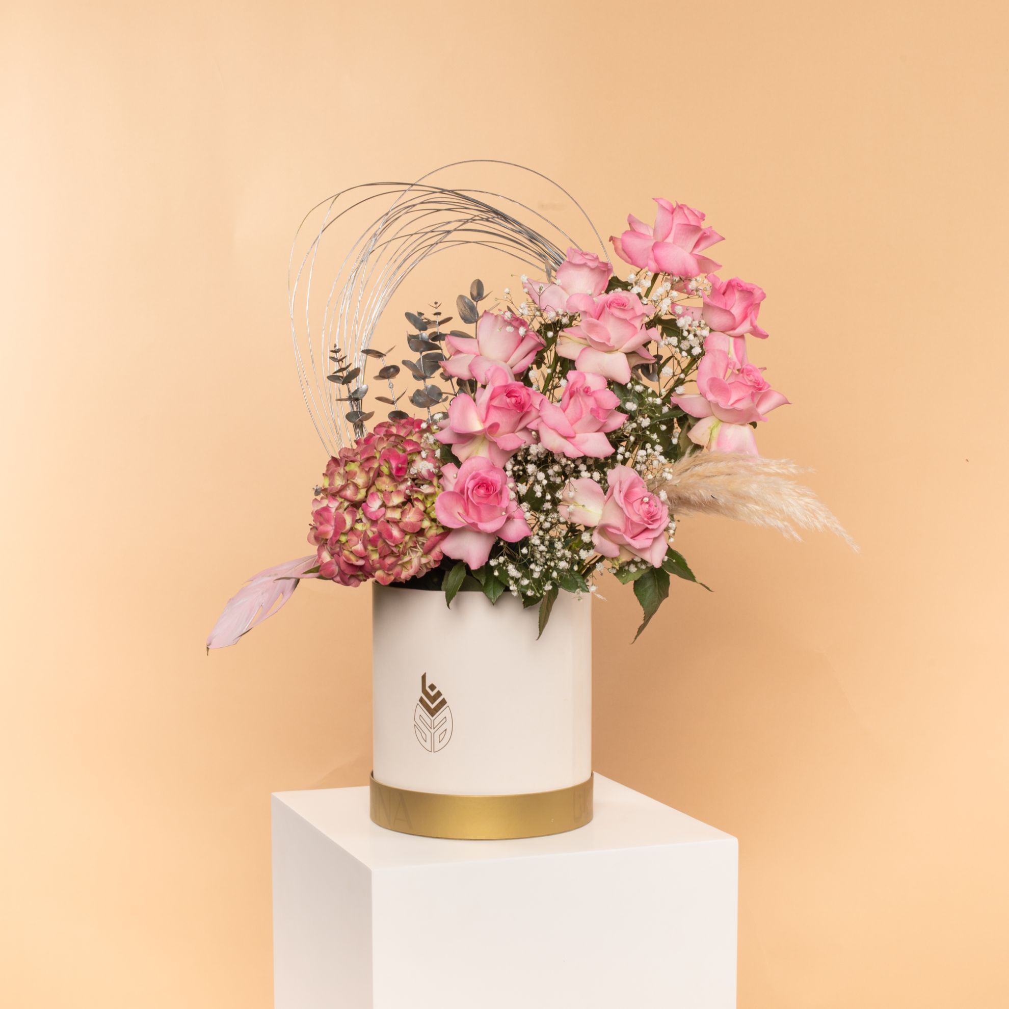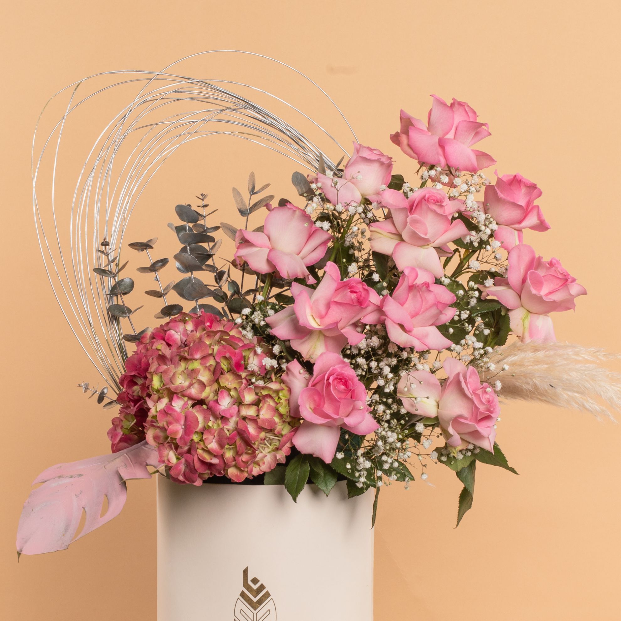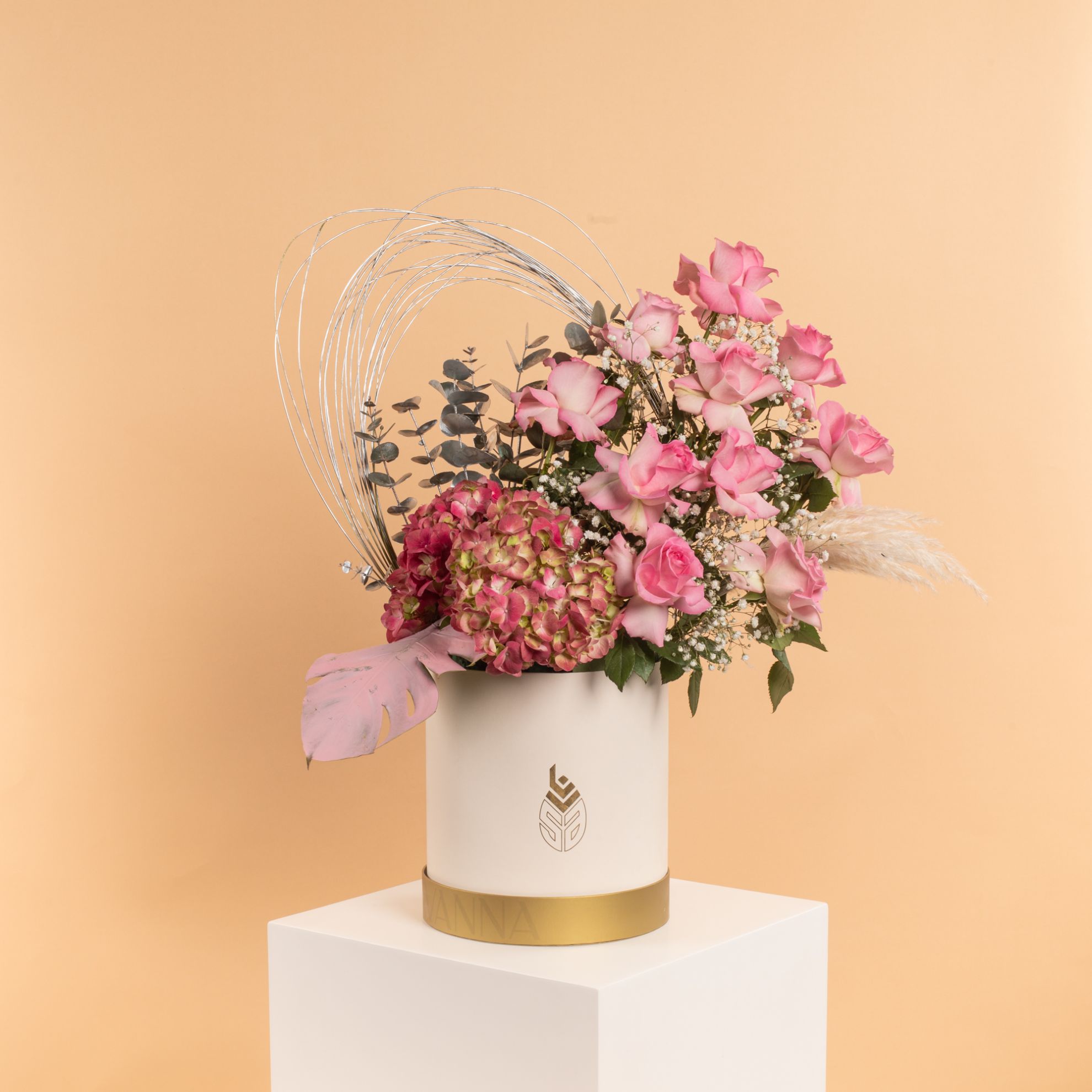 our stunning flower box, featuring a perfect blend, hydrangea, pink rose, steel grass, eucalyptus, asperdistra, gypsophila, pampas, and displayed in a chic Savanna round box. A luxurious and thoughtful gift to brighten any occasion.