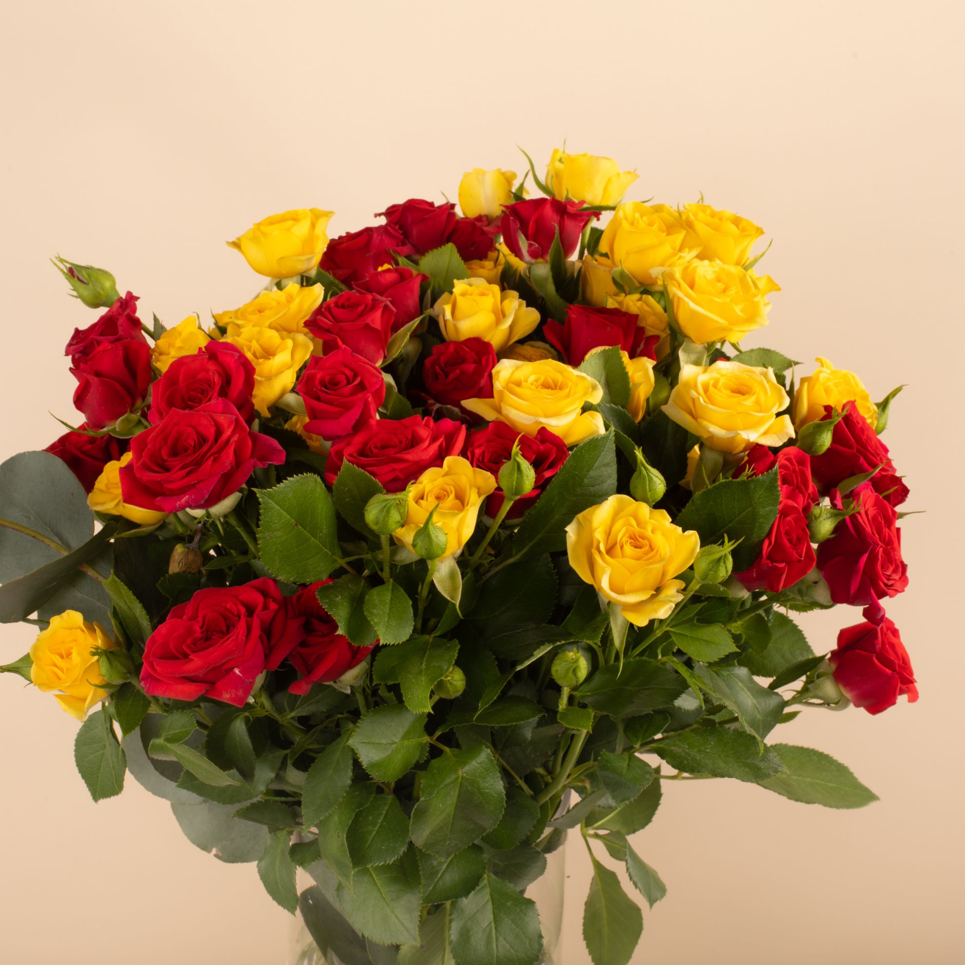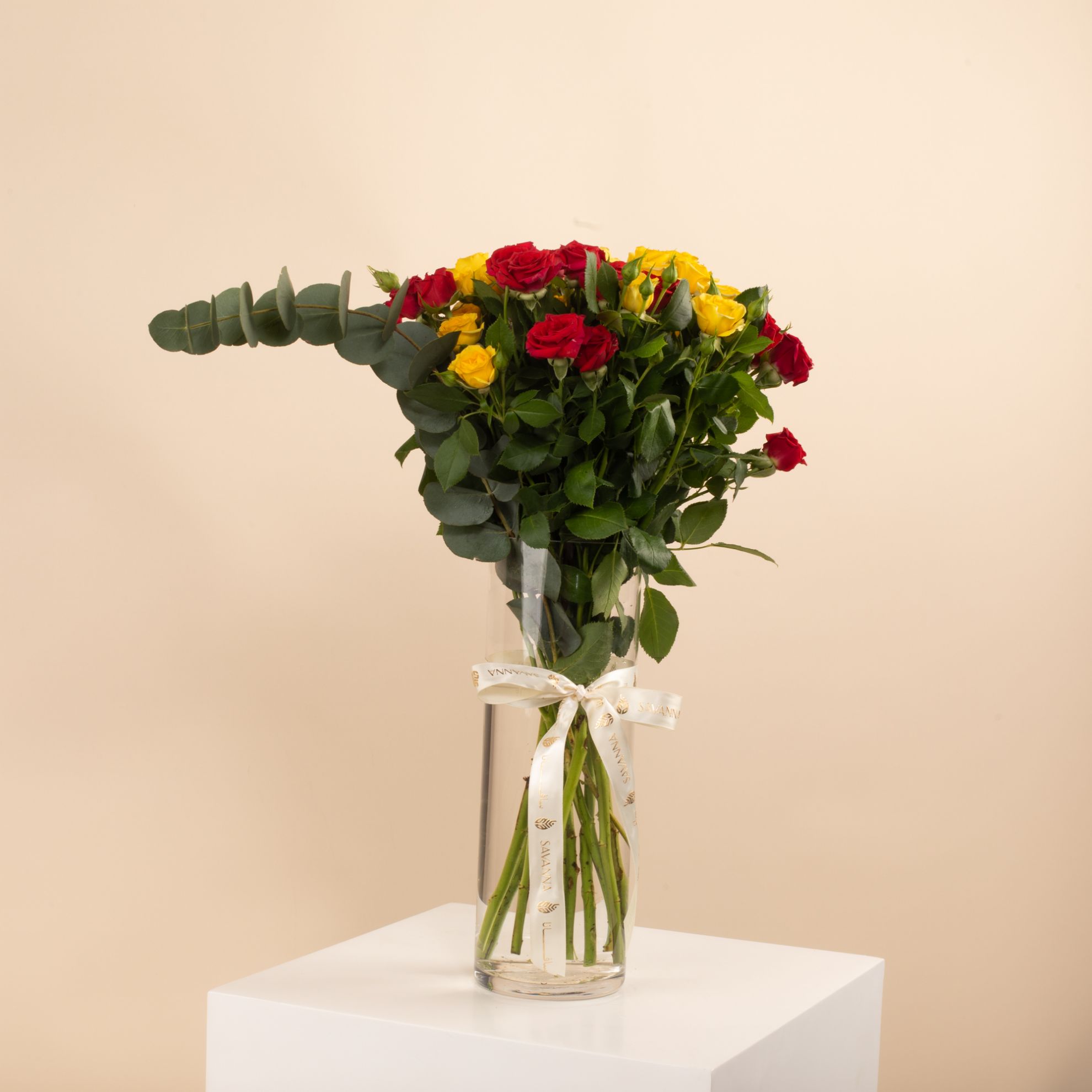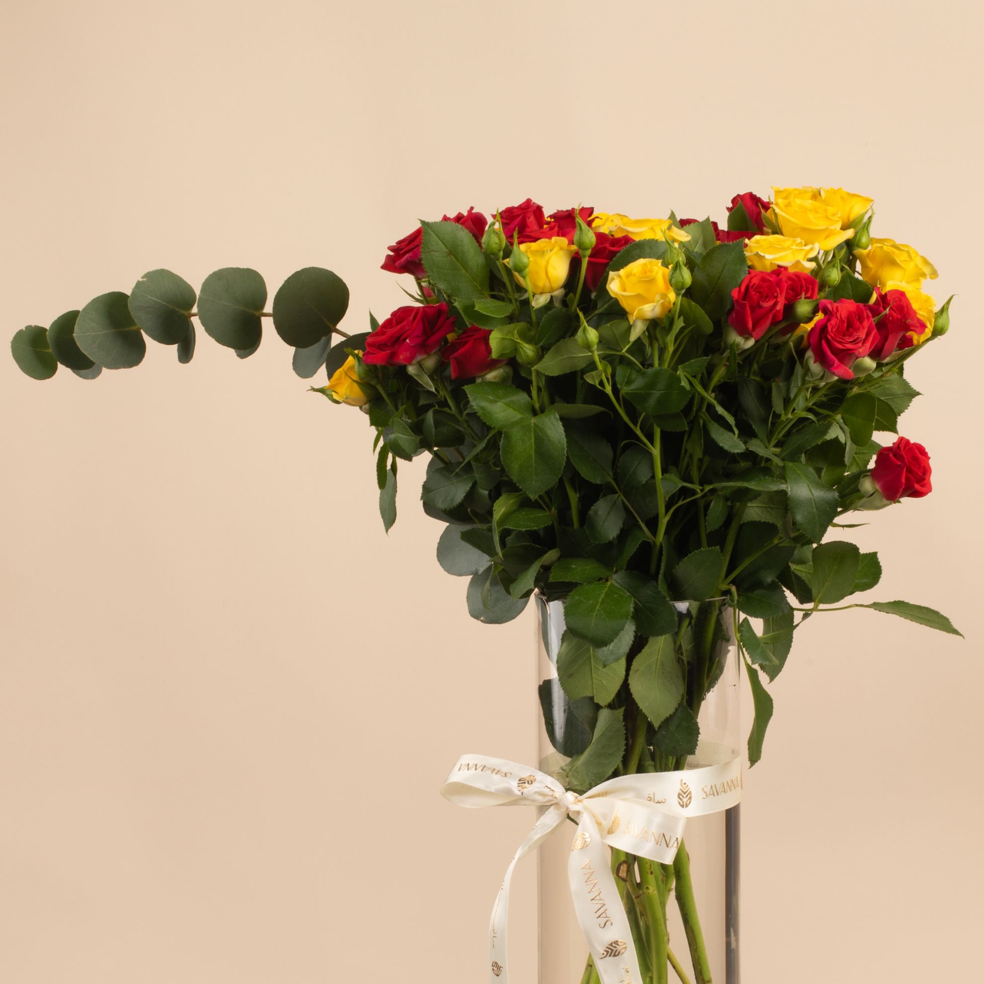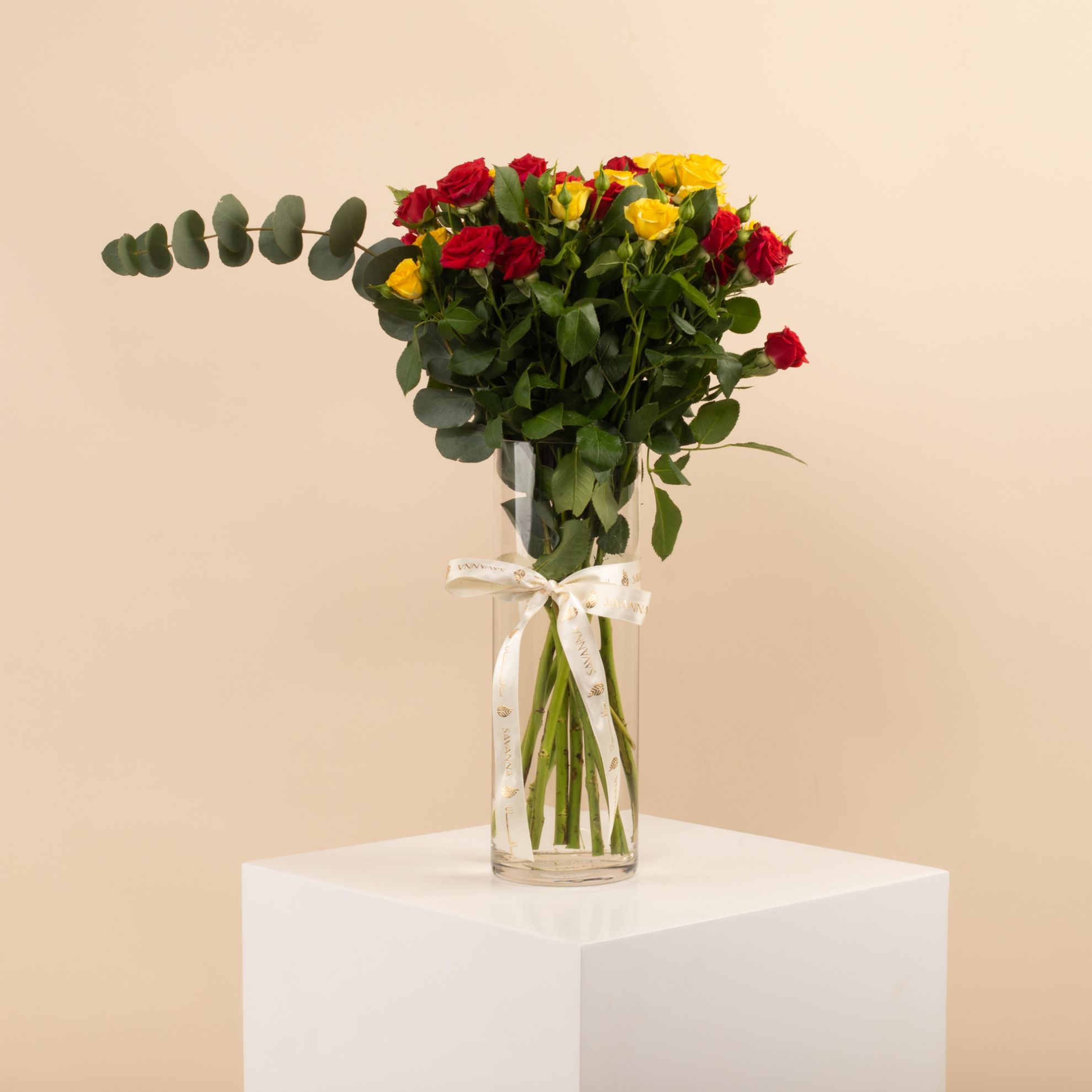 A cheerful arrangement of red and yellow baby roses in a tall Savanna vase. The perfect balance of passion and joy, ideal for brightening any space or gifting with love.