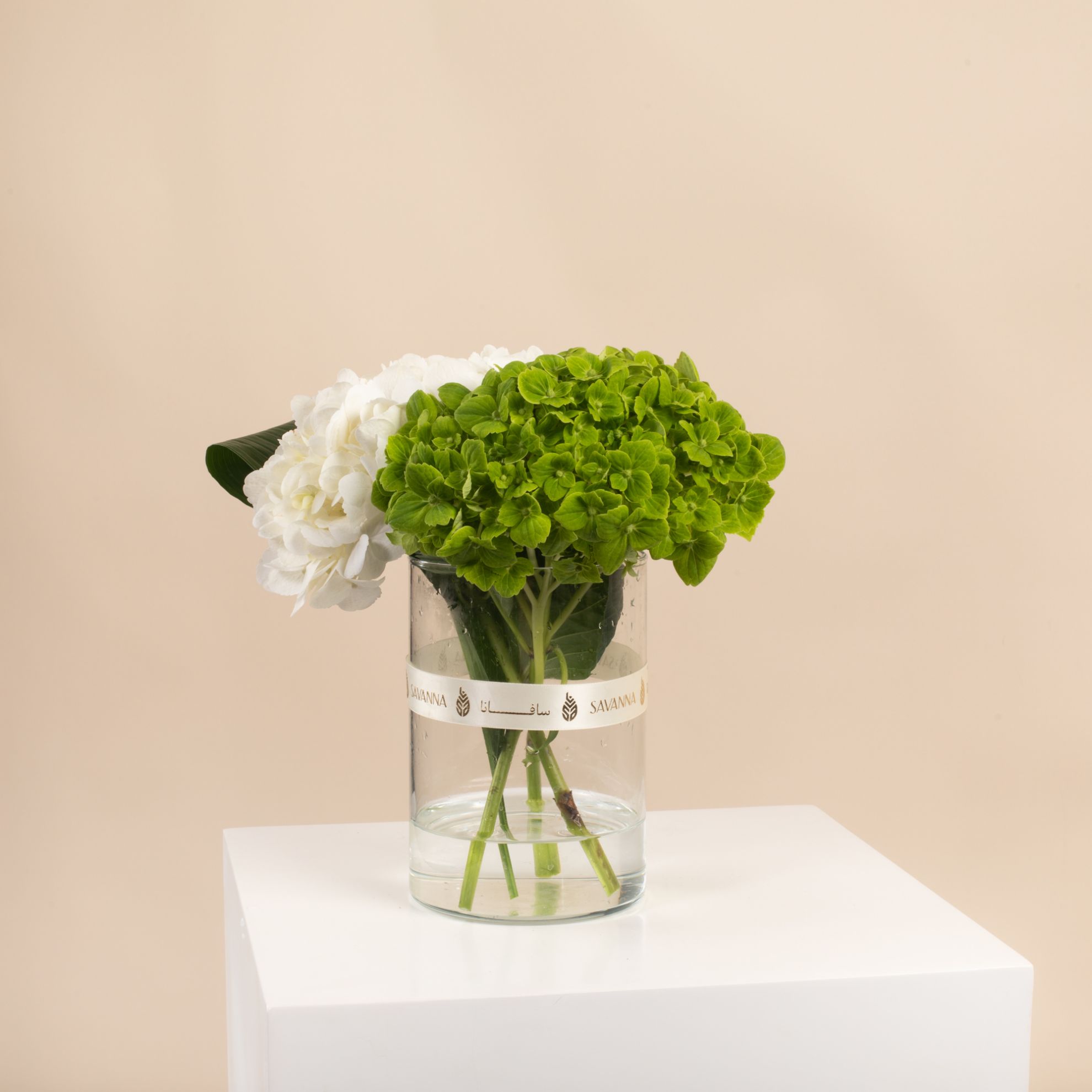 This elegant arrangement features a fresh combination of white and green hydrangeas in a modern glass vase, adorned with a signature Savanna ribbon. A perfect blend of serenity and charm, ideal for any setting.