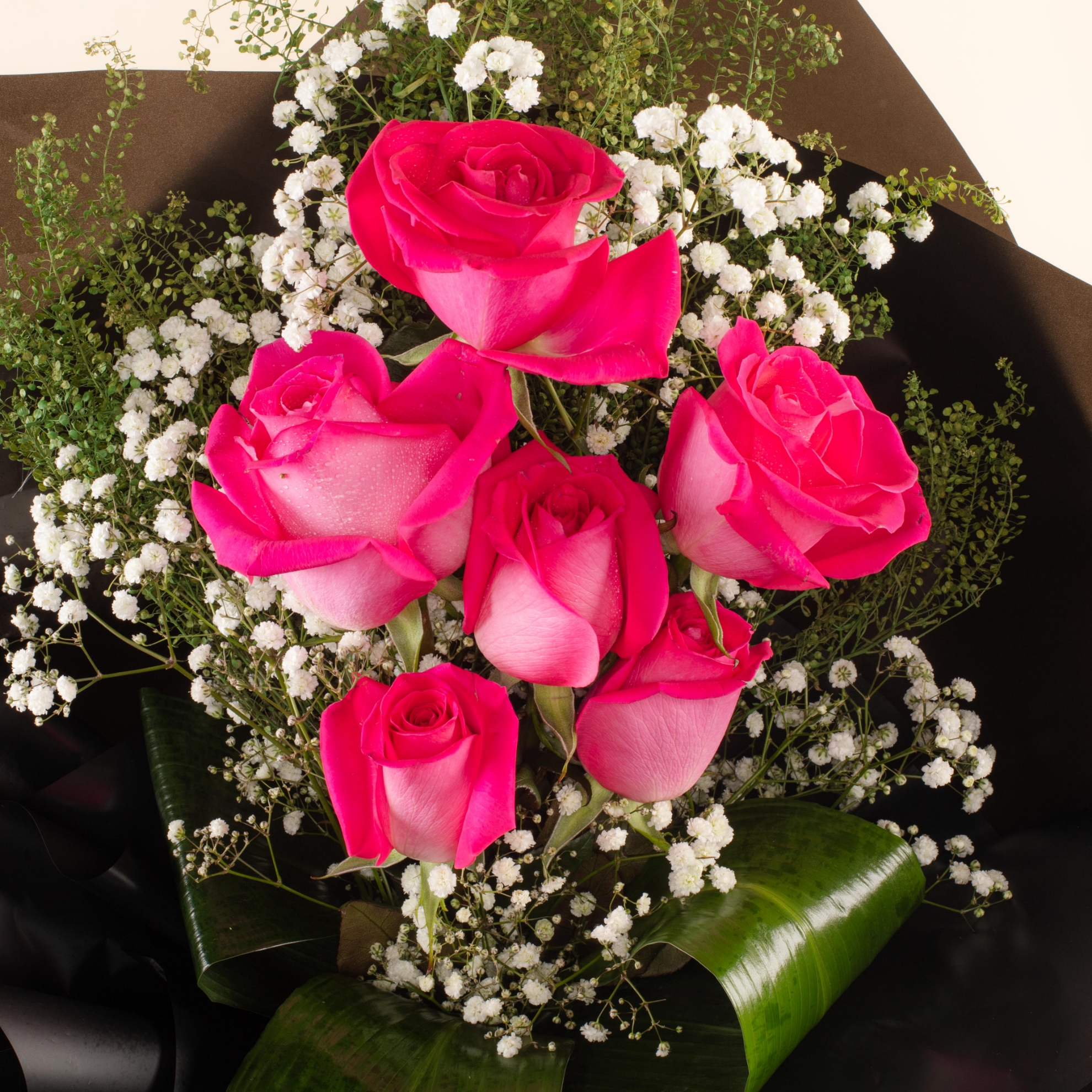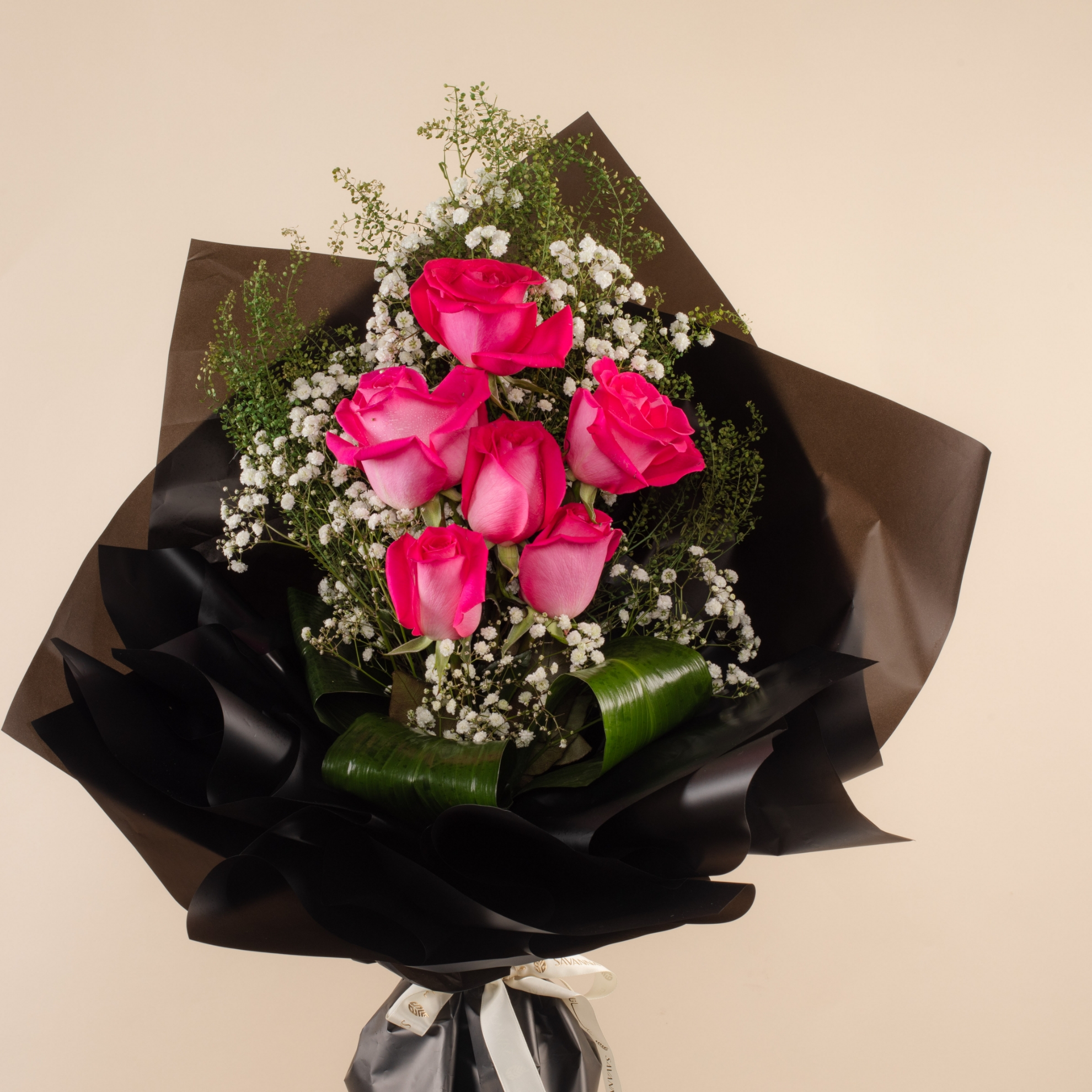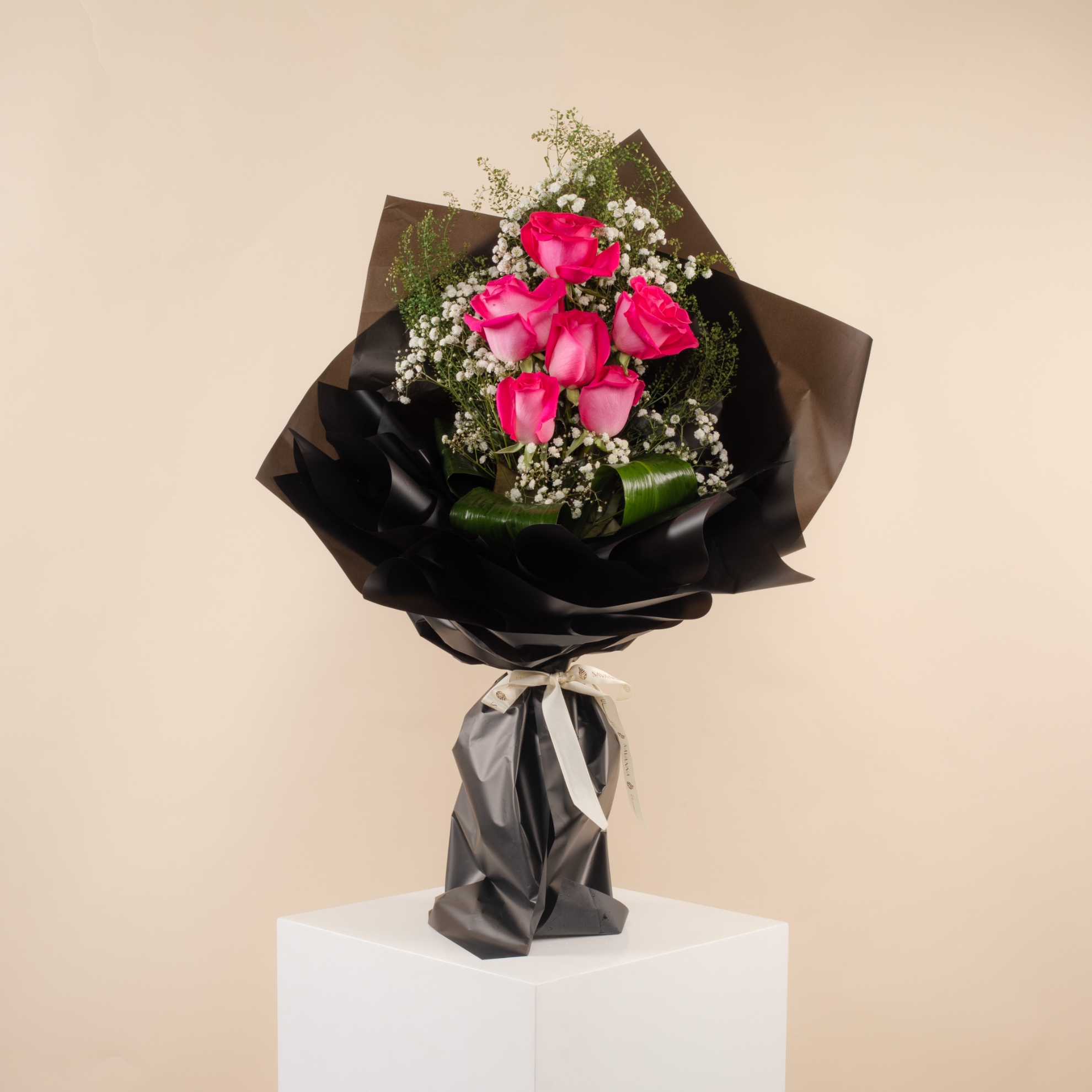 Sweet Fuchsia Hand BouquetA striking hand bouquet featuring 6 fuchsia roses and delicate gypsophila, elegantly wrapped in black. Bold, elegant, and perfect for making a statement.
