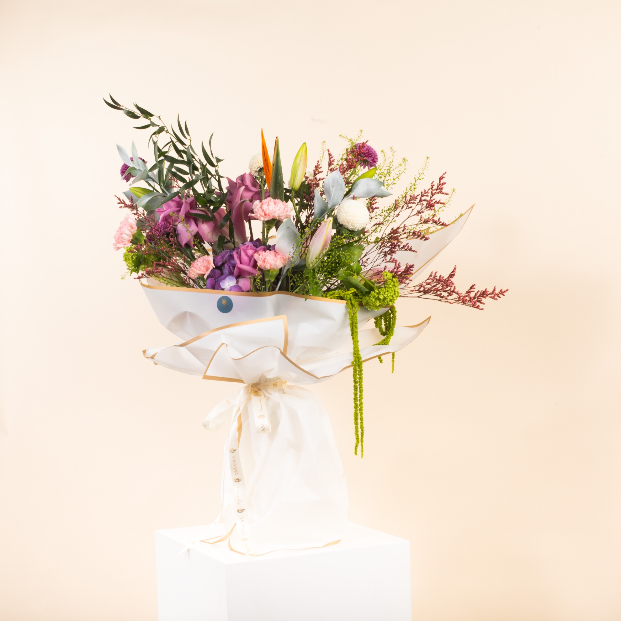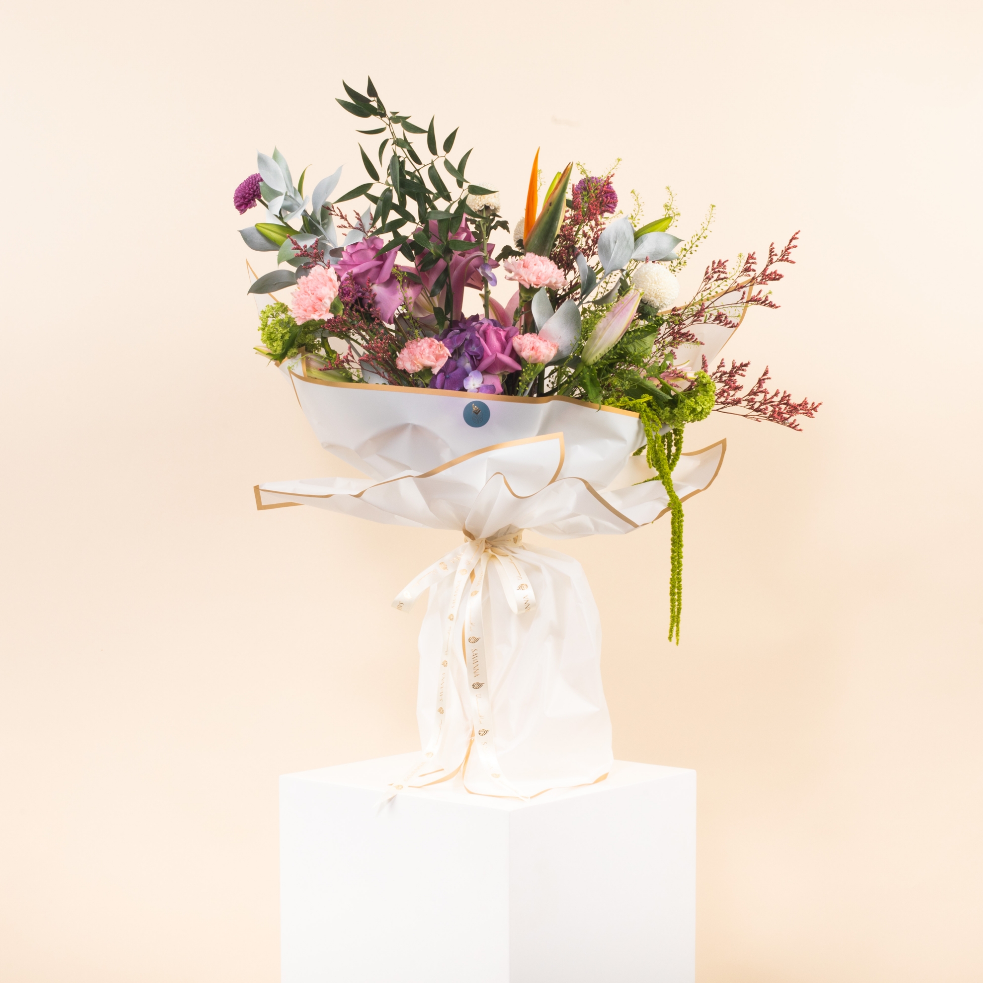 "Experience true luxury with the VVIP Floral Elegance Hand Bouquet—an exquisite blend of purple roses, pink lilies, carnations, hydrangeas, bird of paradise, and lush greenery. A breathtaking gift for the most special moments."
