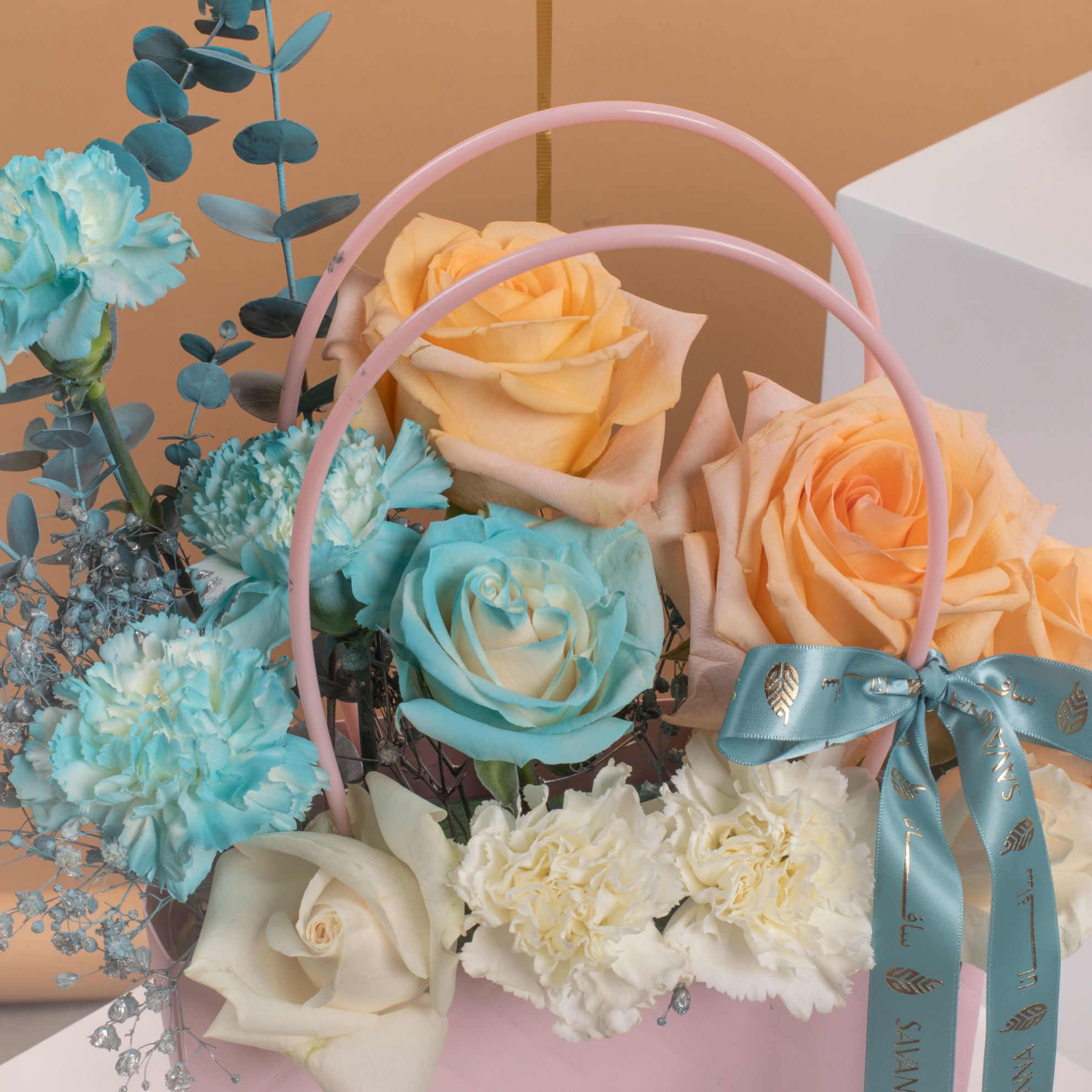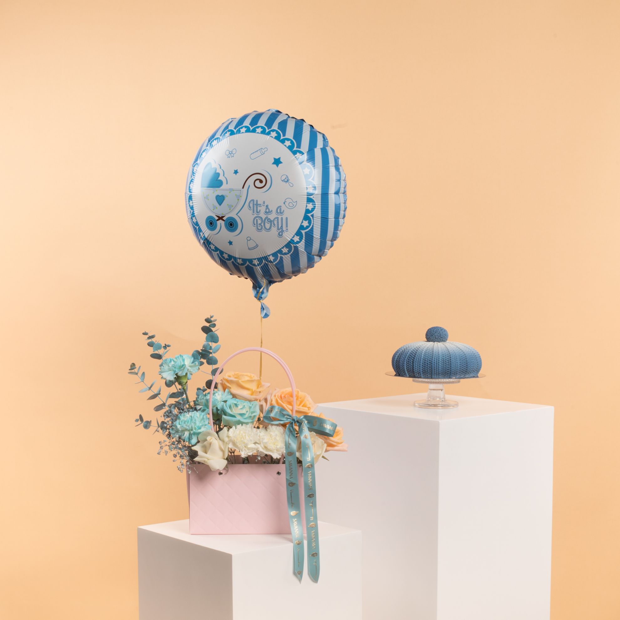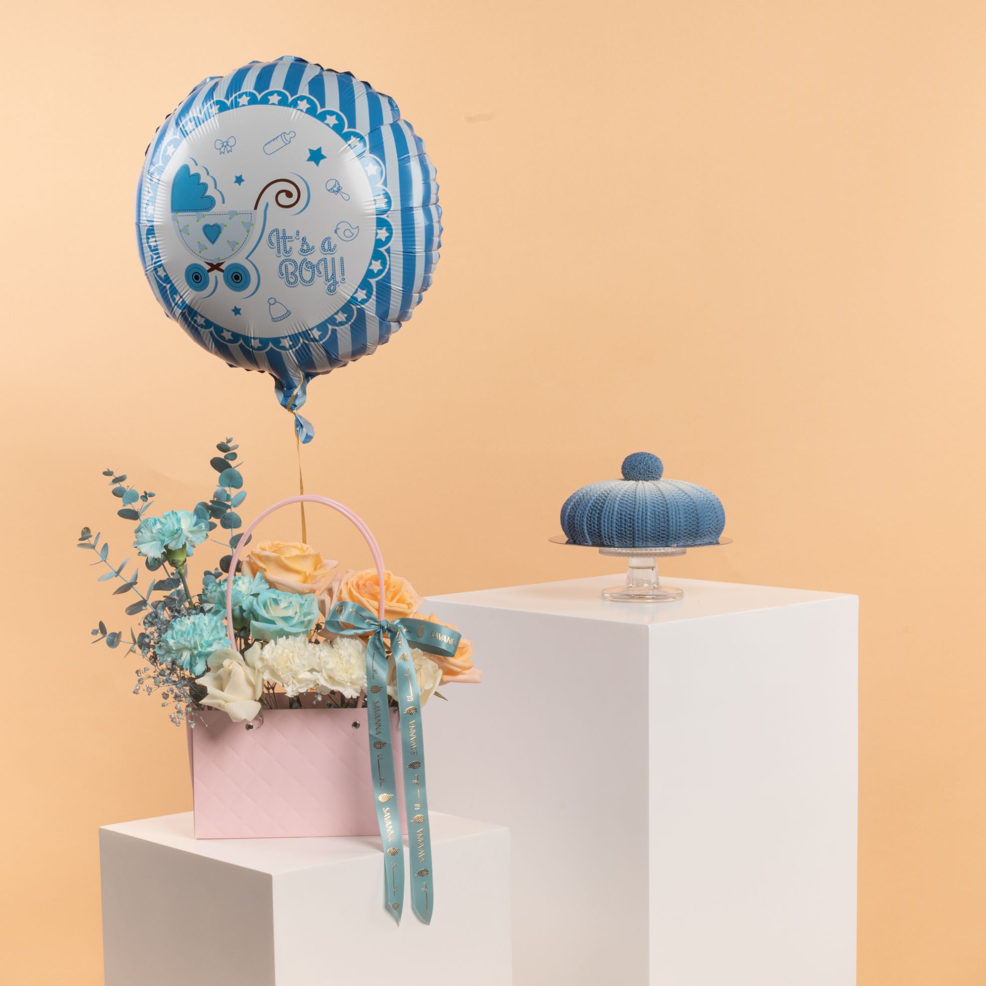 Celebrate the arrival of a baby boy with the Dinara Welcome Baby Boy Cake! This delicious cake comes with a charming "It's a Boy" balloon and a beautiful flower arrangement, including white roses, white carnations, peach roses, and eucalyptus, all elegantly presented in a flower bag. The perfect gift for this special occasion! Available now on Savanna.