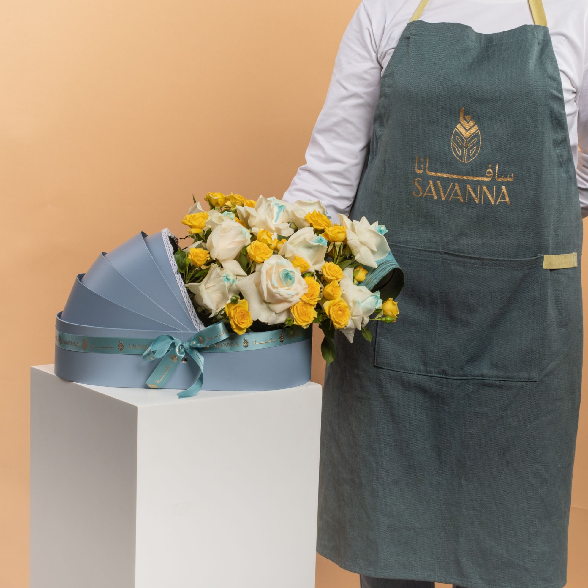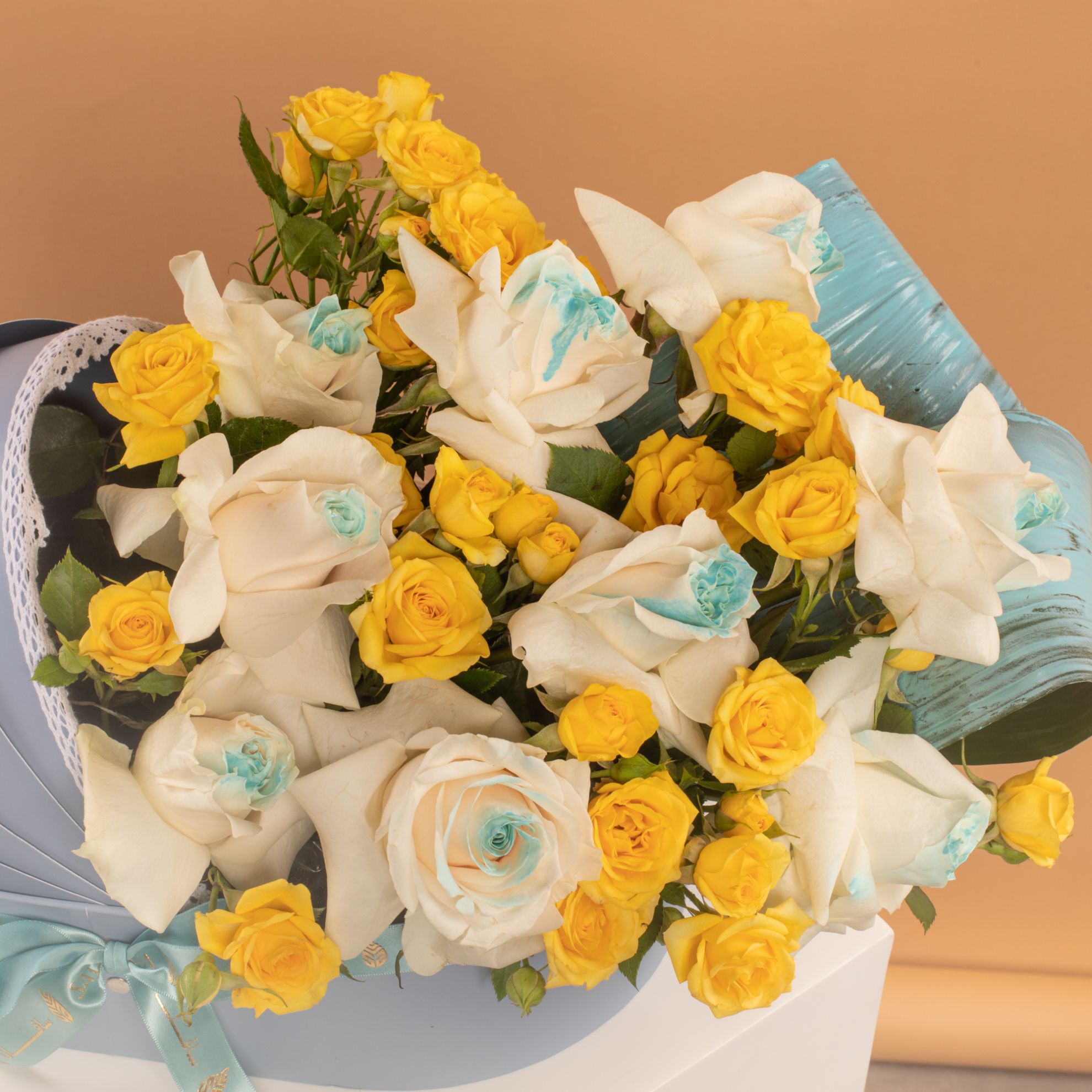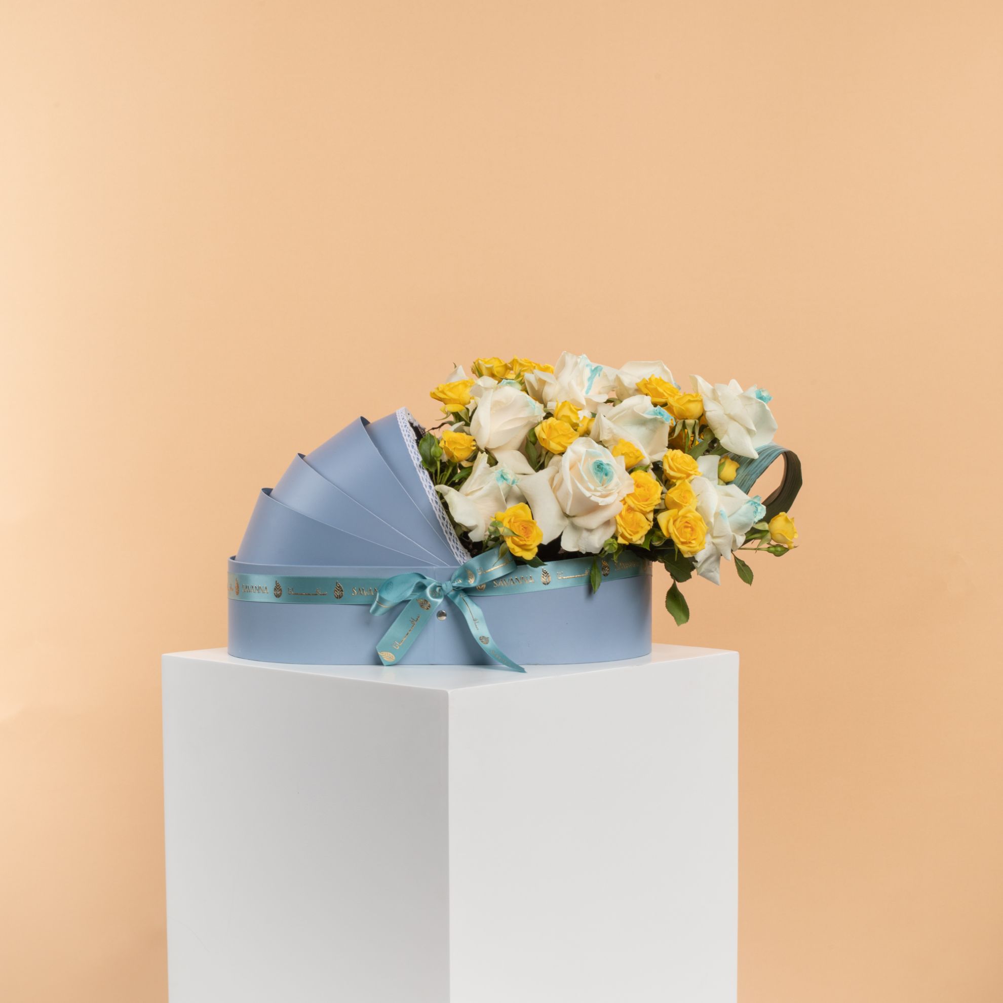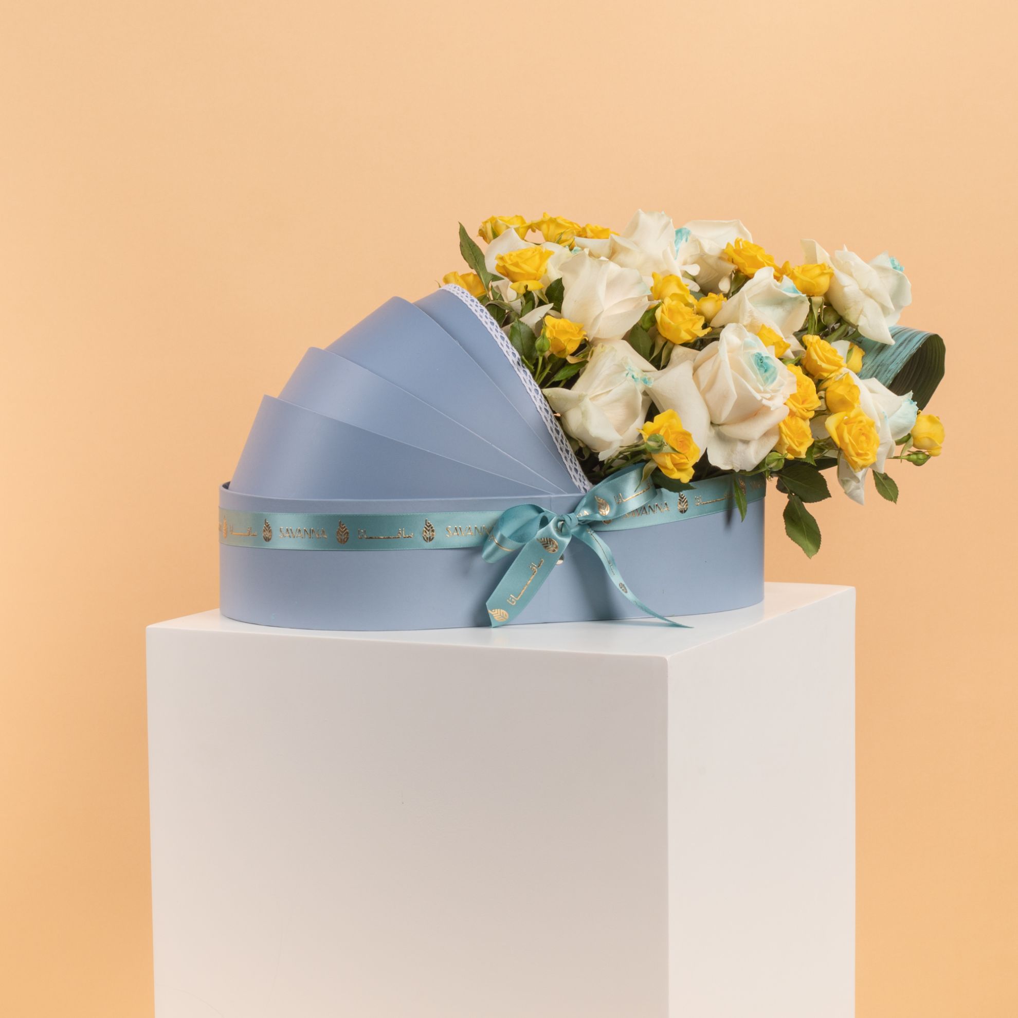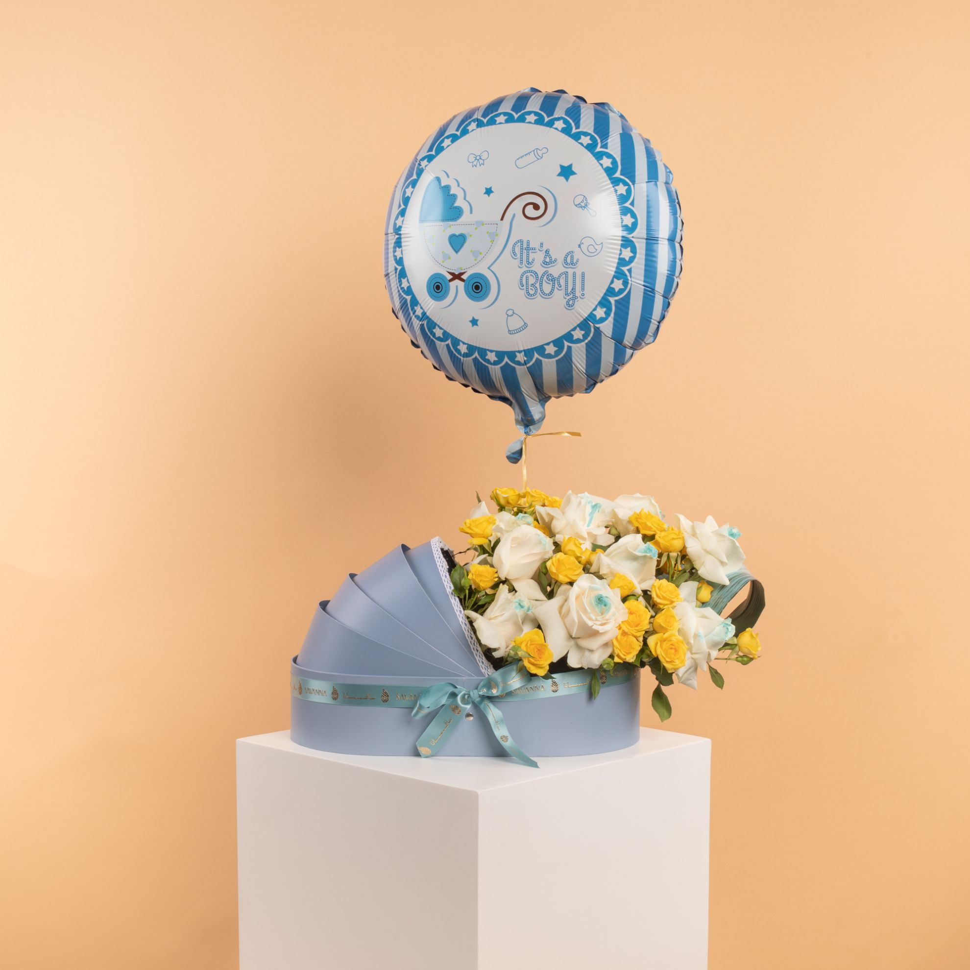 Celebrate the arrival of a baby boy with this lovely flowers gift! It includes a cheerful balloon, white roses, and yellow baby roses, beautifully arranged in a cute baby boy bag. The perfect gift to welcome the little one! Available now on Savanna.
